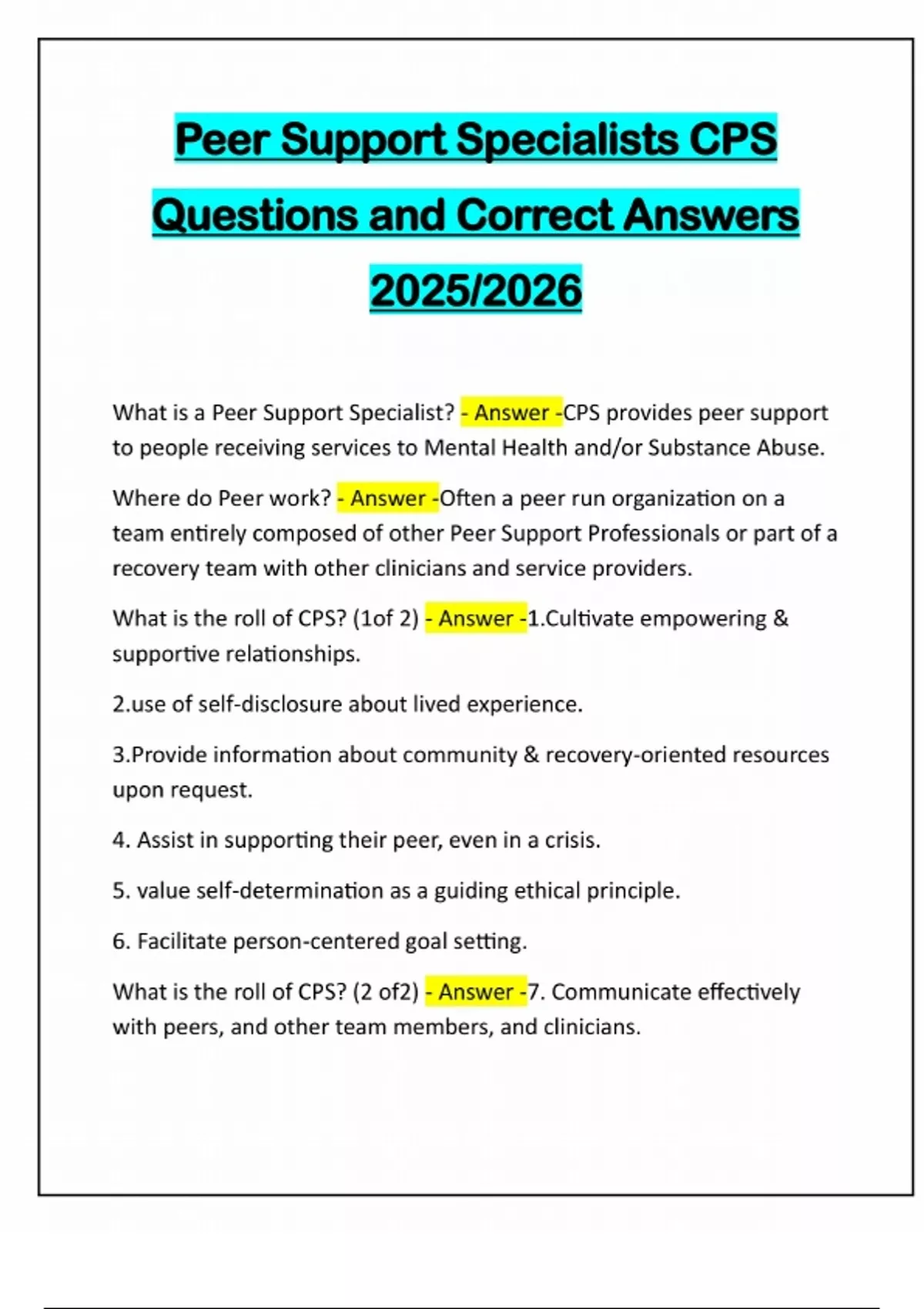 Peer Support Specialists CPS Questions and Correct Answers 2025/2026