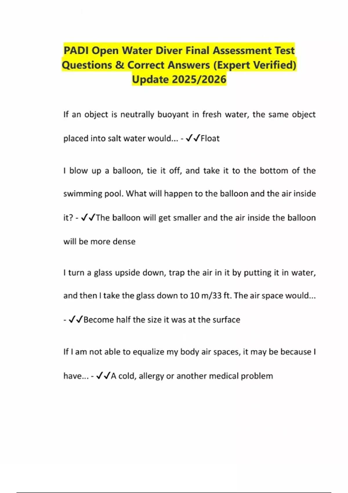 PADI Open Water Diver Final Assessment Test Questions & Correct Answers (Expert Verified) Update 2025/2026 If an object is neutrally buoyant in fresh water, the same object placed into salt water would... - Float I blow up a balloon, tie it off, and take it to the bottom of the swimming pool. What will happen to the balloon and the air inside it? - The balloon will get smaller and the air inside the balloon will be more dense I turn a glass upside down, trap the air in it by putting it in water, and then I take the glass down to 10 m/33 ft. The air space would... - Become half the size it was at the surface If I am not able to equalize my body air spaces, it may be because I have... - A cold, allergy or another medical problemIf my ears or sinuses hurt while I am descending, it usually means... - I am feeling a squeeze and need to equalize The best place for me to position an alternate air source is... - In the triangle area formed by my chin and the lower corners of my rib cage Lung overexpansion injuries can be caused by... - Holding my breath while scuba diving