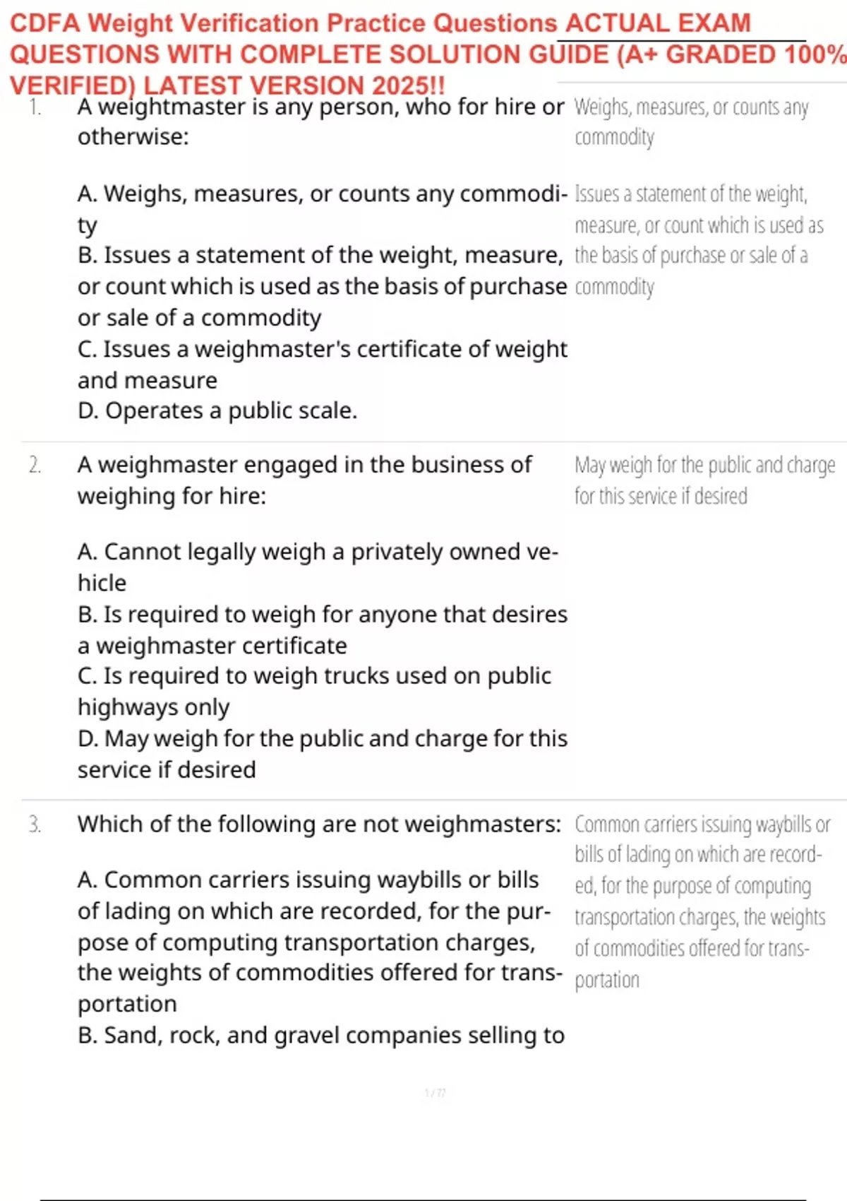 CDFA Weight Verification Practice Questions ACTUAL EXAM QUESTIONS WITH COMPLETE SOLUTION GUIDE (A+ GRADED 100% VERIFIED) LATEST VERSION 2025!!