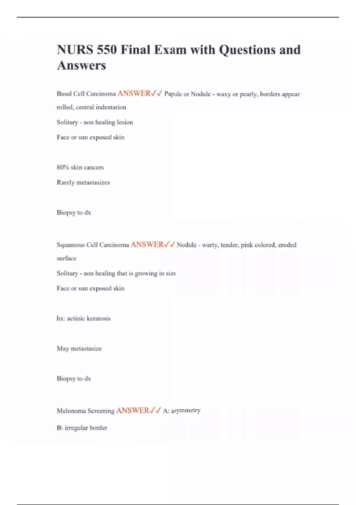 NURS 550 Final Exam with Questions and Answers Basal Cell Carcinoma ANSWER Papule or Nodule - waxy or pearly, borders appear rolled, central indentation Solitary - non healing lesion Face or sun exposed skin 80% skin cancers Rarely metastasizes Biopsy to dx Squamous Cell Carcinoma ANSWER Nodule - warty, tender, pink colored, eroded surface Solitary - non healing that is growing in size Face or sun exposed skin hx: actinic keratosis May metastasize Biopsy to dx Melonoma Screening ANSWER A: asymmetry B: irregular border