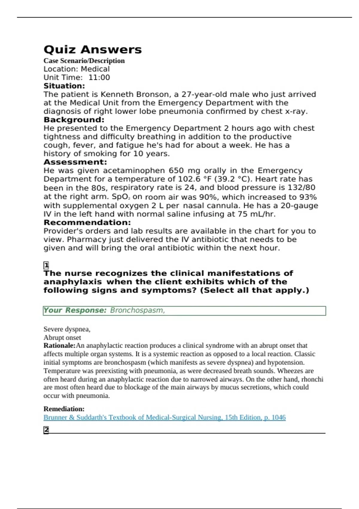Quiz Answers Case Scenario/Description Location: Medical Unit Time: 11:00 Situation: The patient is Kenneth Bronson, a 27-year-old male who just arrived at the Medical Unit from the Emergency Department with the diagnosis of right lower lobe pneumonia confirmed by chest x-ray. Background: He presented to the Emergency Department 2 hours ago with chest tightness and difficulty breathing in addition to the productive cough, fever, and fatigue he's had for about a week. He has a history of smoking for 10 years. Assessment: He was given acetaminophen 650 mg orally in the Emergency Department for a temperature of 102.6 °F (39.2 °C). Heart rate has been in the 80s, respiratory rate is 24, and blood pressure is 132/80 at the right arm. SpO2 on room air was 90%, which increased to 93% with supplemental oxygen 2 L per nasal cannula. He has a 20-gauge IV in the left hand with normal saline infusing at 75 mL/hr. Recommendation: Provider's orders and lab results are available in the chart for you to view. Pharmacy just delivered the IV antibiotic that needs to be given and will bring the oral antibiotic within the next hour. 1 The nurse recognizes the clinical manifestations of anaphylaxis when the client exhibits which of the following signs and symptoms? (Select all that apply.)