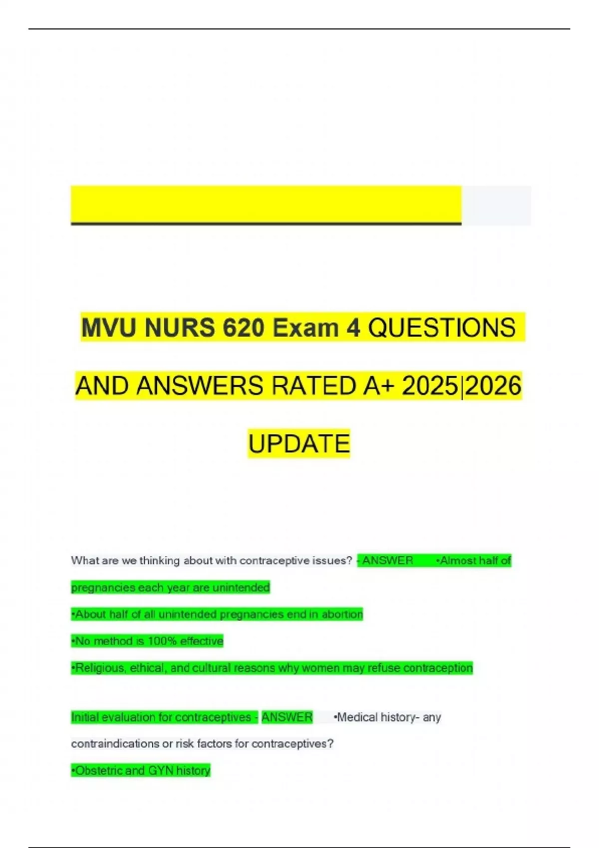 MVU NURS 620 Exam 4 QUESTIONS AND ANSWERS RATED A+ 2025|2026 UPDATE What are we thinking about with contraceptive issues? - ANSWER •Almost half of MVU NURS 620 Exam 4 QUESTIONS AND ANSWERS RATED A+ 2025|2026 UPDATE pregnancies each year are unintended •About half of all unintended pregnancies end in abortion •No method is 100% effective •Religious, ethical, and cultural reasons why women may refuse contraception Initial evaluation for contraceptives - contraindications or risk factors for contraceptives? •Obstetric and GYN history ANSWER •Medical history- any•Physical exam -Pap Smear- when was their last one? -Wet mount -GC/chlamydia DNA probe test HIV & syphillis testing annually if they are sexually active. - ANSWER •Gynecological history and physical exam essential and should address -Risk for STIs and history of BC methods- nothing but condoms reduce risk for STI's. -Sexual dysfunction/concerns -Health promotion (weight gain is it a concern, are they already over weight) -Menstrual cycle information -Medications used (what problems has the patient had in the past with contraceptive methods) -Previous Pap smears and resolutions -Cigarette, alcohol, and drug use/abuse ANSWER •Chance -Failure rate is 85% per year Method of contraception •Coitus Interruptus - ANSWER -Withdrawal of penis before ejaculation -Failure rate is @ 27% -Not ideal, but better than no method - (failure rate similar to barrier methods) -Advantages - no artificial barriers, chemicals, or devices