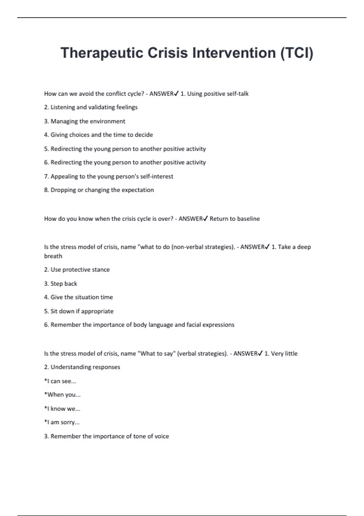 Therapeutic Crisis Intervention (TCI) (Latest 2025 / 2026 Update) Questions and Correct answers (100% Verified Answers) A+ Succes...