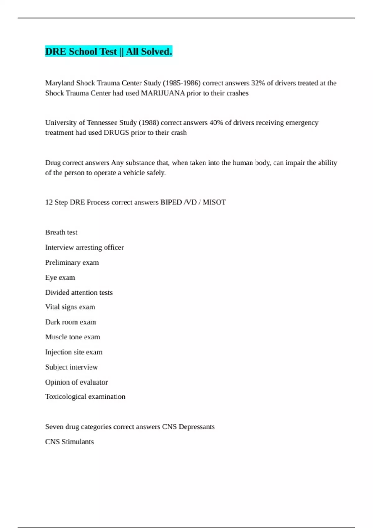 Seven drug categories correct answers CNS Depressants