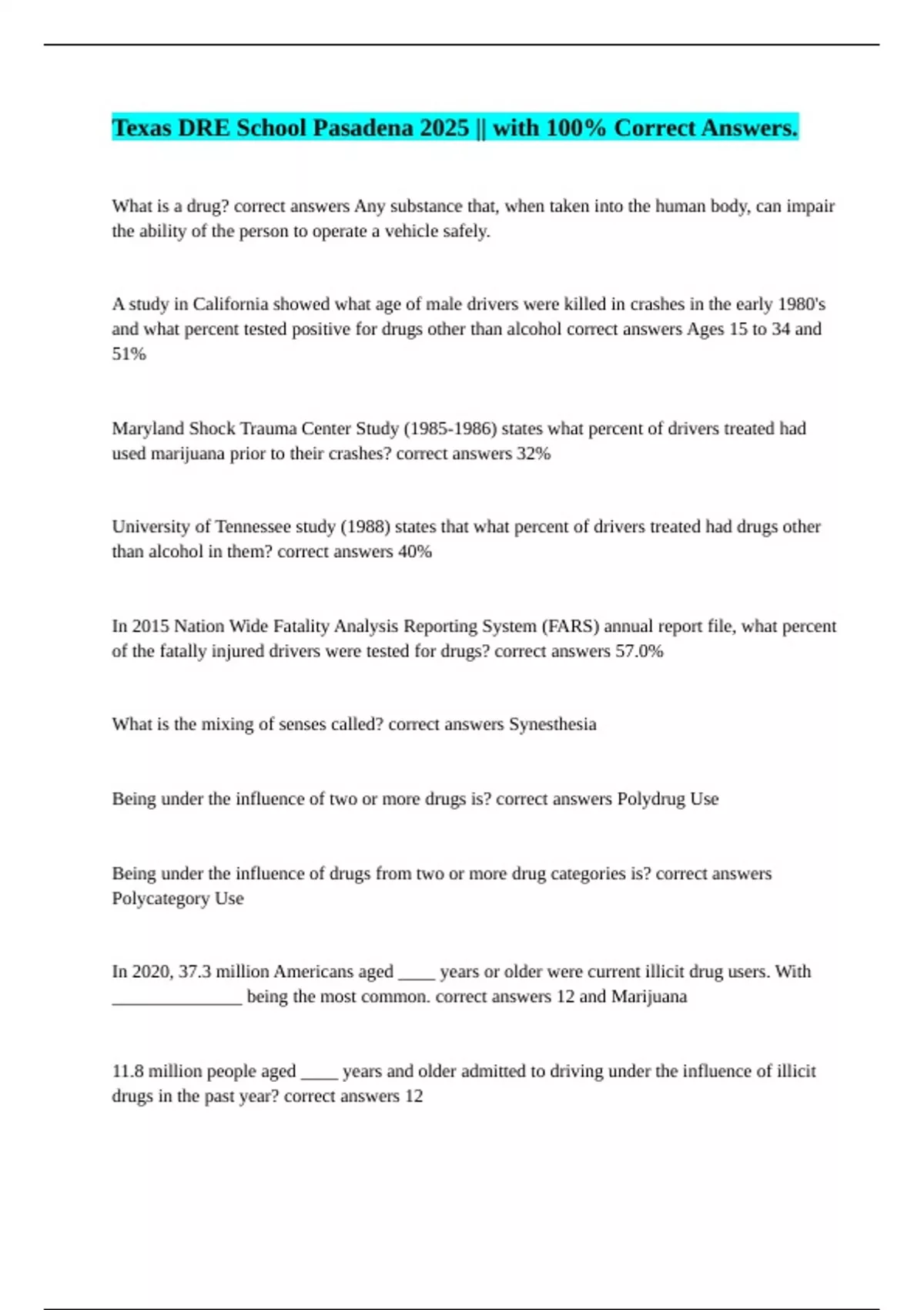 What is a drug? correct answers Any substance that, when taken into the human body, can impair the ability of the person to operate a vehicle safely. A study in California showed what age of male drivers were killed in crashes in the early 1980's and what percent tested positive for drugs other than alcohol correct answers Ages 15 to 34 and 51% Maryland Shock Trauma Center Study () states what percent of drivers treated had used marijuana prior to their crashes? correct answers 32% University of Tennessee study (1988) states that what percent of drivers treated had drugs other than alcohol in them? correct answers 40% In 2015 Nation Wide Fatality Analysis Reporting System (FARS) annual report file, what percent of the fatally injured drivers were tested for drugs? correct answers 57.0% What is the mixing of senses called? correct answers Synesthesia Being under the influence of two or more drugs is? correct answers Polydrug Use Being under the influence of drugs from two or more drug categories is? correct answers Polycategory Use In 2020, 37.3 million Americans aged ____ years or older were current illicit drug users. With ______________ being the most common. correct answers 12 and Marijuana 11.8 million people aged ____ years and older admitted to driving under the influence of illicit drugs in the past year? correct answers 12