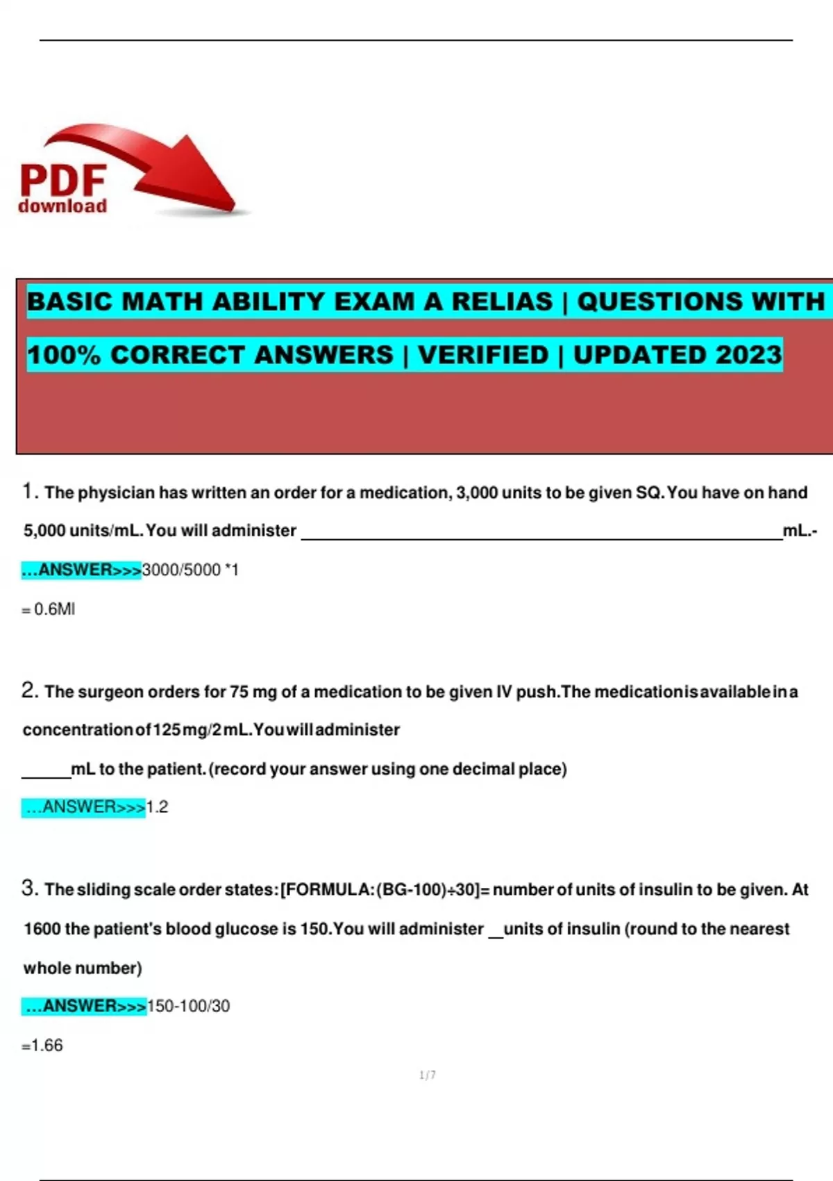 Basic Math Ability Exam A Relias | Questions with 100% Correct Answers | Verified | Updated 2023|with all pages