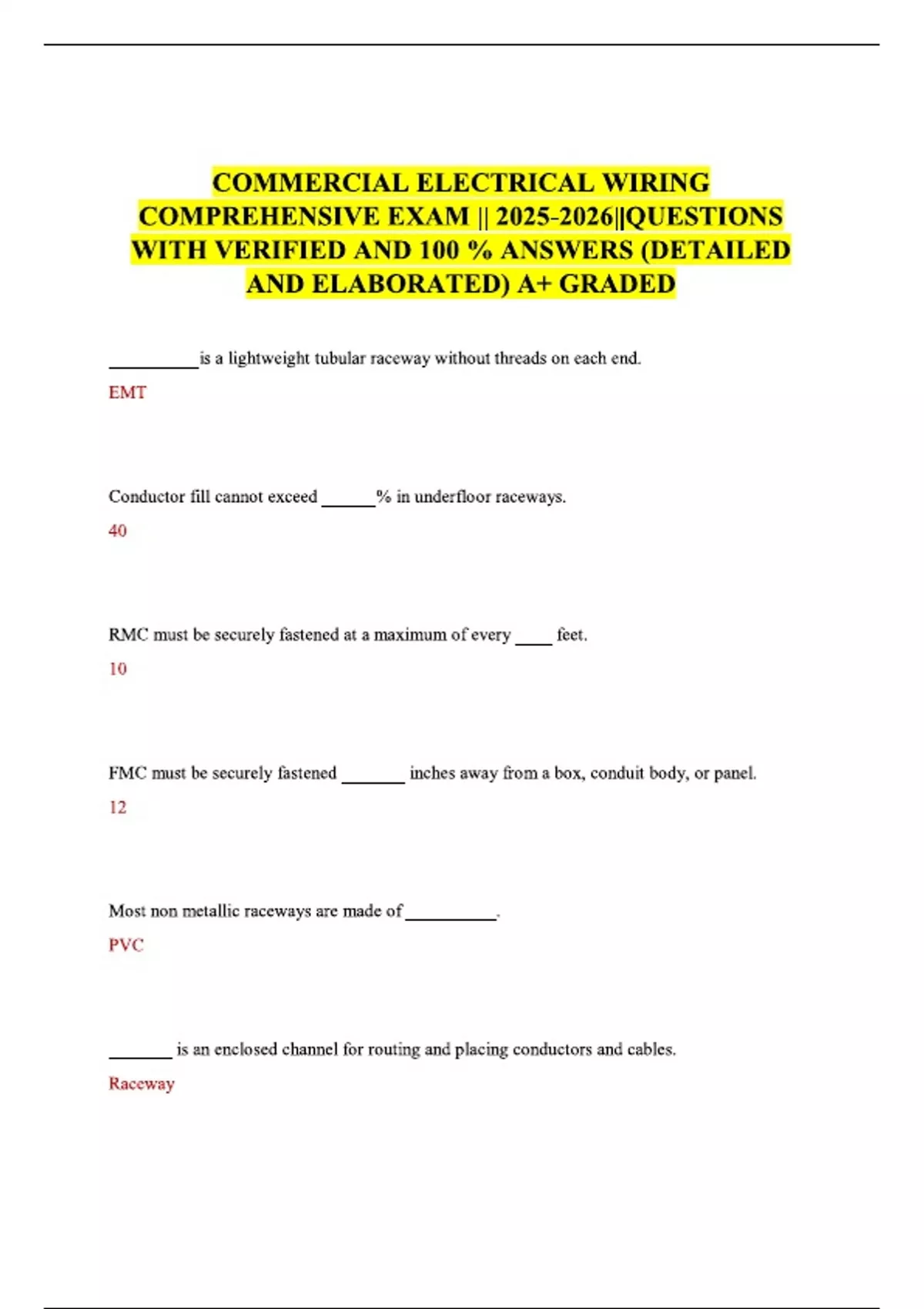 COMMERCIAL ELECTRICAL WIRING COMPREHENSIVE EXAM || ||QUESTIONS WITH VERIFIED AND 100 % ANSWERS (DETAILED AND ELABORATED) A+ GRADED
