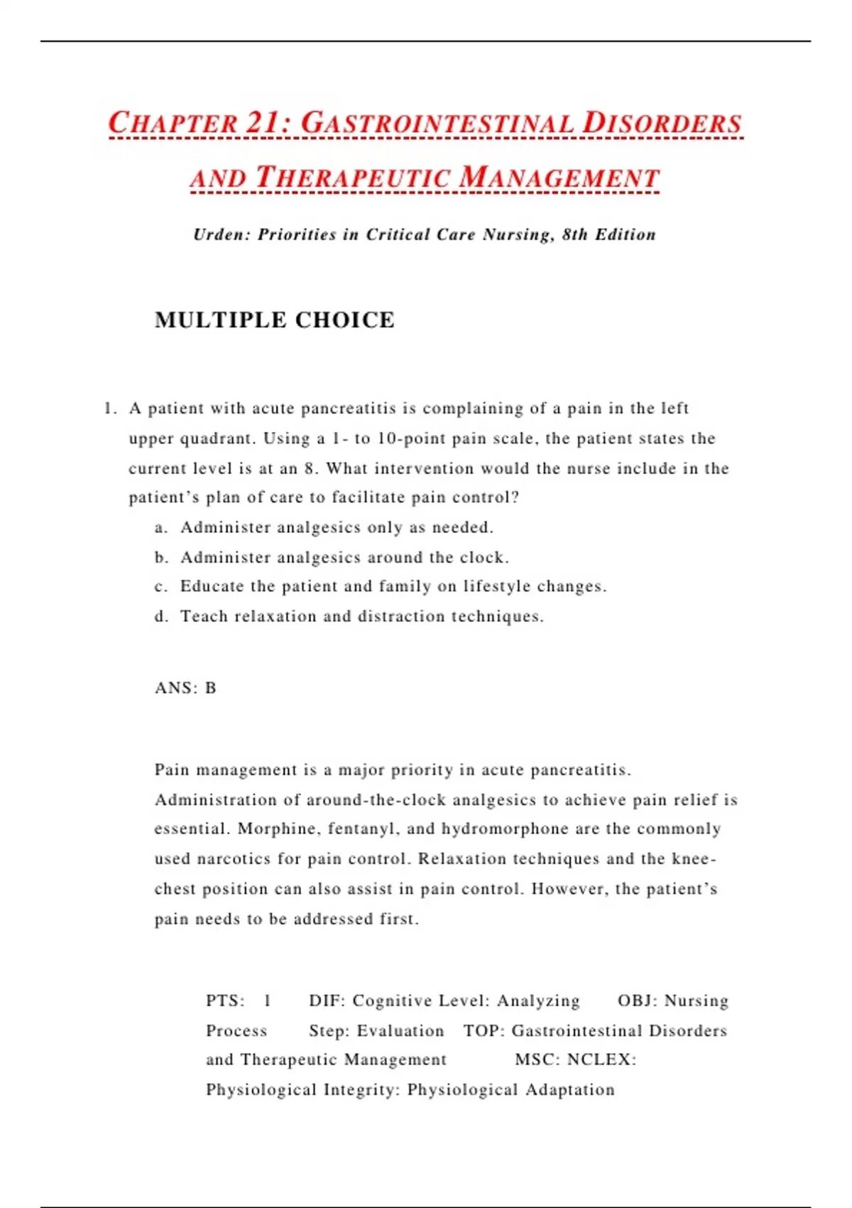 Urden: Priorities in Critical Care Nursing, 8th Edition MULTIPLE CHOICE 1. A patient with acute pancreatitis is complaining of a pain in the left upper quadrant. Using a 1- to 10-point pain scale, the patient states the current level is at an 8. What intervention would the nurse include in the patient’s plan of care to facilitate pain control? a. Administer analgesics only as needed. b. Administer analgesics around the clock. c. Educate the patient and family on lifestyle changes. d. Teach relaxation and distraction techniques. ANS: B Pain management is a major priority in acute pancreatitis. Administration of around-the-clock analgesics to achieve pain relief is essential. Morphine, fentanyl, and hydromorphone are the commonly used narcotics for pain control. Relaxation techniques and the knee-chest position can also assist in pain control. However, the patient’s pain needs to be addressed first. PTS: 1 DIF: Cognitive Level: Analyzing OBJ: Nursing Process Step: Evaluation TOP: Gastrointestinal Disorders and Therapeutic Management MSC: NCLEX: Physiological Integrity: Physiological Adaptation 2. A patient with a history of chronic alcoholism was admitted with acute pancreatitis. The nurse is developing a patient education plan. Which topic would the nurse include in the plan? a. Diabetes management b. Alcohol cessation c. Occult blood testing d. Anticoagulation management ANS: B As the patient moves toward discharge, teaching should focus on the interventions necessary for preventing the recurrence of the precipitating disorder. If an alcohol abuser, the patient should be encouraged to stop drinking and be referred to an alcohol cessation program. PTS: 1 DIF: Cognitive Level: Applying OBJ: Nursing Process Step: Implementation TOP: Gastrointestinal Disorders and Therapeutic Management MSC: NCLEX: Health Promotion and Maintenance 3. A Salem sump nasogastric tube has two lumens. The first lumen is for suction and drainage. What is the purpose of the second lumen? a. Allows for administration of tube feeding. b. Allows for testing of gastric secretions. c. Prevents tube from adhering to the gastric wall. d. Prevents the tube from advancing.