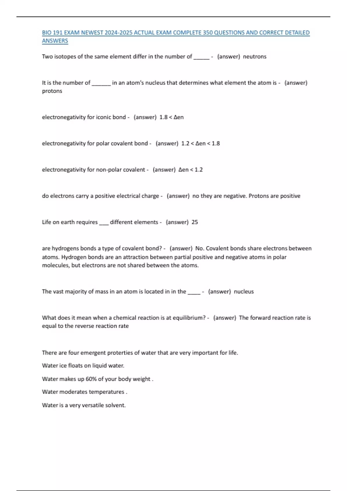 BIO 191 EXAM NEWEST 2024-2025 ACTUAL EXAM COMPLETE 350 QUESTIONS AND CORRECT DETAILED