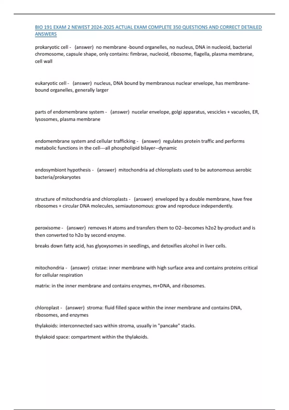 BIO 191 EXAM 2 NEWEST 2024-2025 ACTUAL EXAM COMPLETE 350 QUESTIONS AND CORRECT DETAILED