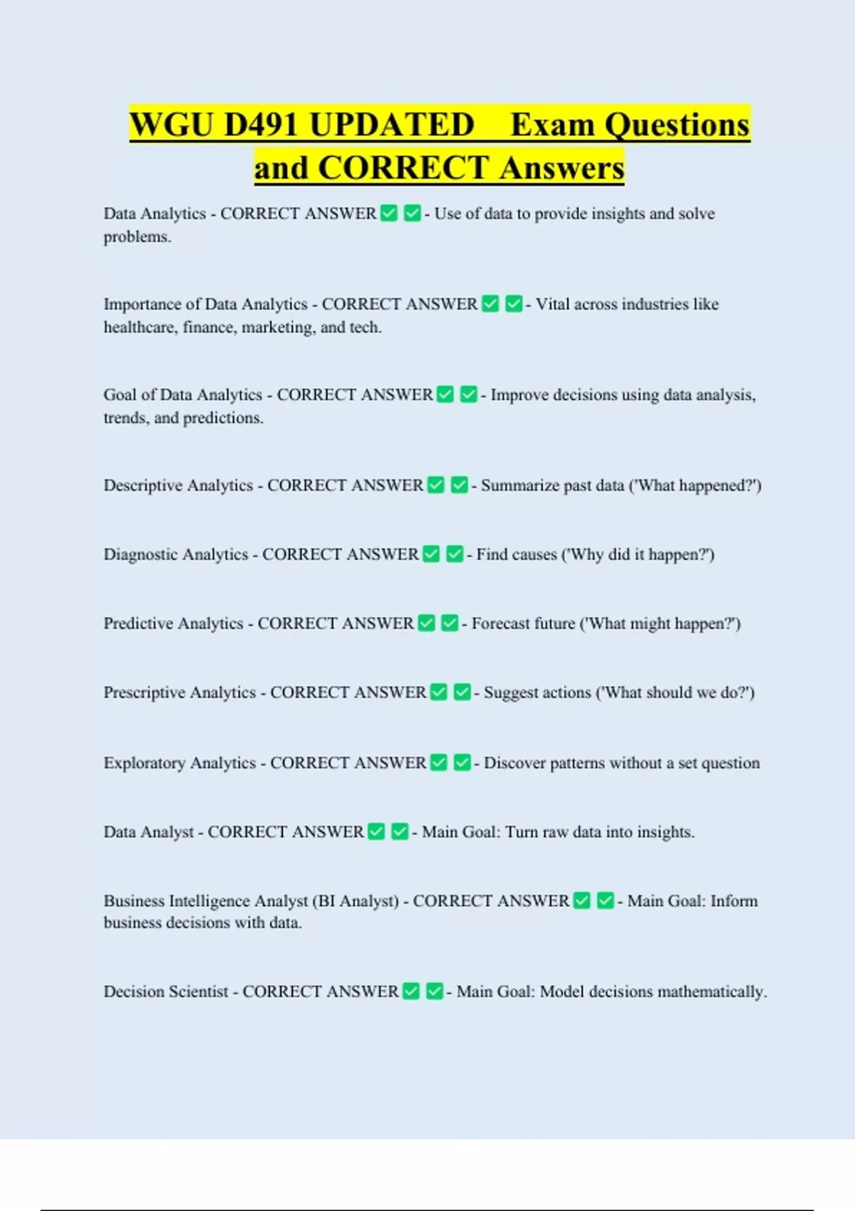 Goal of Data Analytics - CORRECT ANSWER - Improve decisions using data analysis,