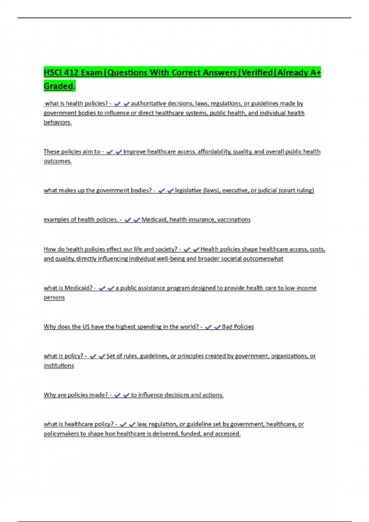 HSCI 412 Exam|Questions With Correct Answers|Verified|Already A+ Graded
