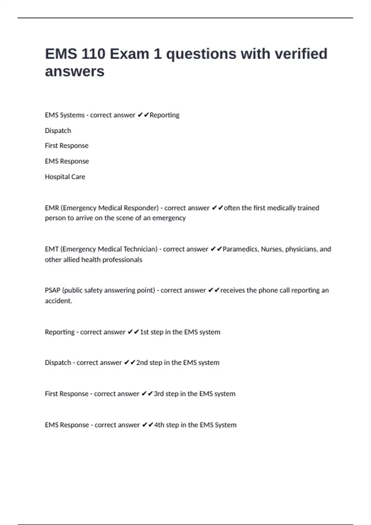 EMS 110 Exam 1 questions with verified answersEMS Systems - correct answer Reporting Dispatch First Response EMS Response Hospital Care EMR (Emergency Medical Responder) - correct answer often the first medically trained person to arrive on the scene of an emergency EMT (Emergency Medical Technician) - correct answer Paramedics, Nurses, physicians, and other allied health professionals PSAP (public safety answering point) - correct answer receives the phone call reporting an accident. Reporting - correct answer 1st step in the EMS system