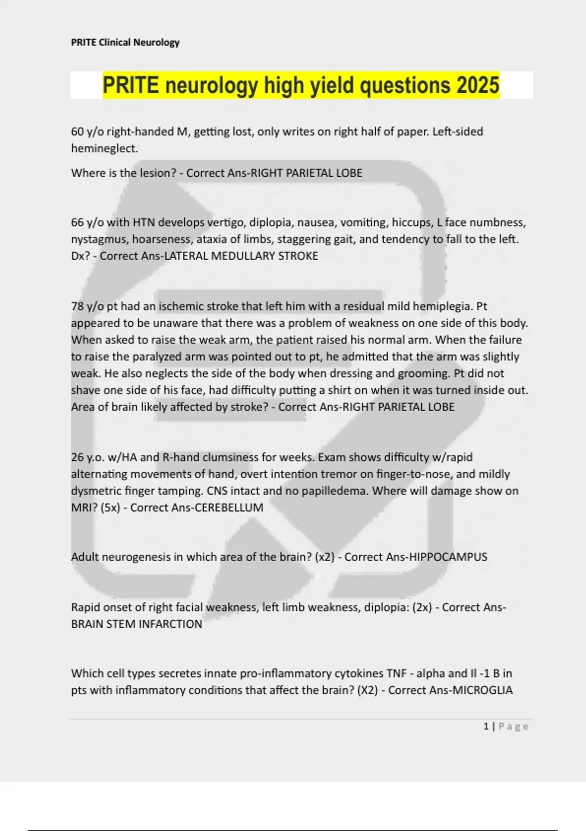 60 y/o right-handed M, getting lost, only writes on right half of paper. Left-sided hemineglect. Where is the lesion? - Correct Ans-RIGHT PARIETAL LOBE 66 y/o with HTN develops vertigo, diplopia, nausea, vomiting, hiccups, L face numbness, nystagmus, hoarseness, ataxia of limbs, staggering gait, and tendency to fall to the left. Dx? - Correct Ans-LATERAL MEDULLARY STROKE 78 y/o pt had an ischemic stroke that left him with a residual mild hemiplegia. Pt appeared to be unaware that there was a problem of weakness on one side of this body. When asked to raise the weak arm, the patient raised his normal arm. When the failure to raise the paralyzed arm was pointed out to pt, he admitted that the arm was slightly weak. He also neglects the side of the body when dressing and grooming. Pt did not shave one side of his face, had difficulty putting a shirt on when it was turned inside out. Area of brain likely affected by stroke? - Correct Ans-RIGHT PARIETAL LOBE 26 y.o. w/HA and R-hand clumsiness for weeks. Exam shows difficulty w/rapid alternating movements of hand, overt intention tremor on finger-to-nose, and mildly dysmetric finger tamping. CNS intact and no papilledema. Where will damage show on MRI? (5x) - Correct Ans-CEREBELLUM Adult neurogenesis in which area of the brain? (x2) - Correct Ans-HIPPOCAMPUS Rapid onset of right facial weakness, left limb weakness, diplopia: (2x) - Correct Ans-BRAIN STEM INFARCTION Which cell types secretes innate pro-inflammatory cytokines TNF - alpha and Il -1 B in pts with inflammatory conditions that affect the brain? (X2) - Correct Ans-MICROGLIA