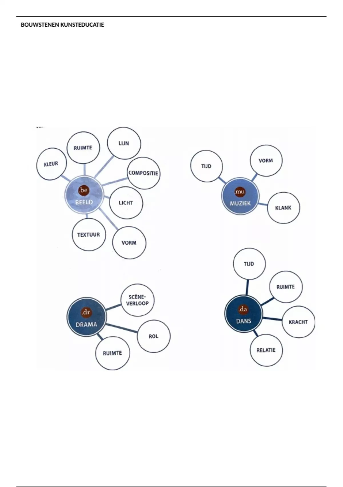 Dit is een samenvatting van het vak kunsteducatie. Hier kunt u de bouwstenen zien van dans, drama, muziek en beeld met ook de sub-bouwstenen + extra uitleg.