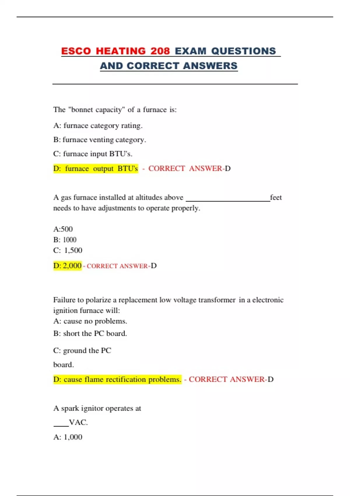 This document contains the full set of ESCO Heating 208 exam questions along with their correct answers, covering essential topics for HVAC technician certification. Topics include furnace operation, gas pressures, venting requirements, electrical diagnostics, ignition systems, thermodynamics, and safety protocols. Ideal for exam candidates and professionals seeking review material, it features over 100 multiple-choice questions structured to reflect the official ESCO exam format.