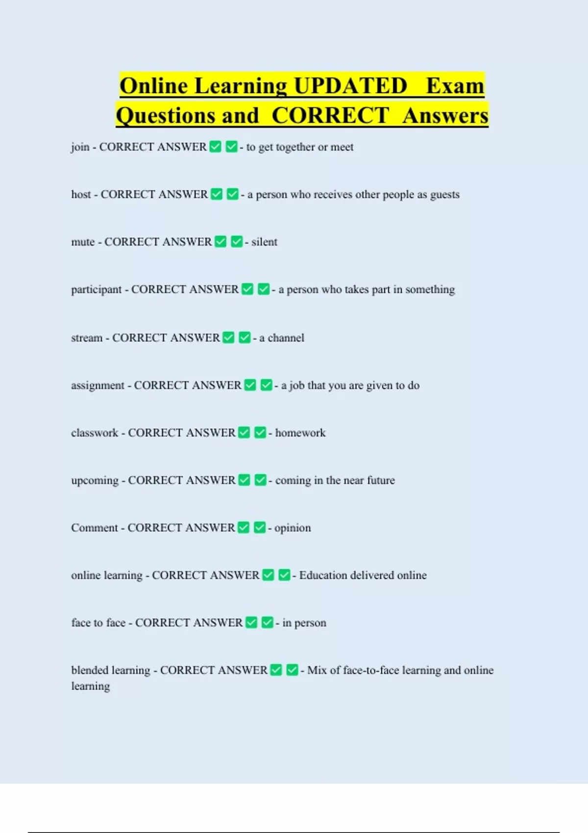 Online Learning UPDATED Exam Questions and CORRECT Answers join - CORRECT ANSWER host - CORRECT ANSWER mute - CORRECT ANSWER participant - CORRECT ANSWER stream - CORRECT ANSWER - to get together or meet - a person who receives other people as guests - silent - a person who takes part in somethi