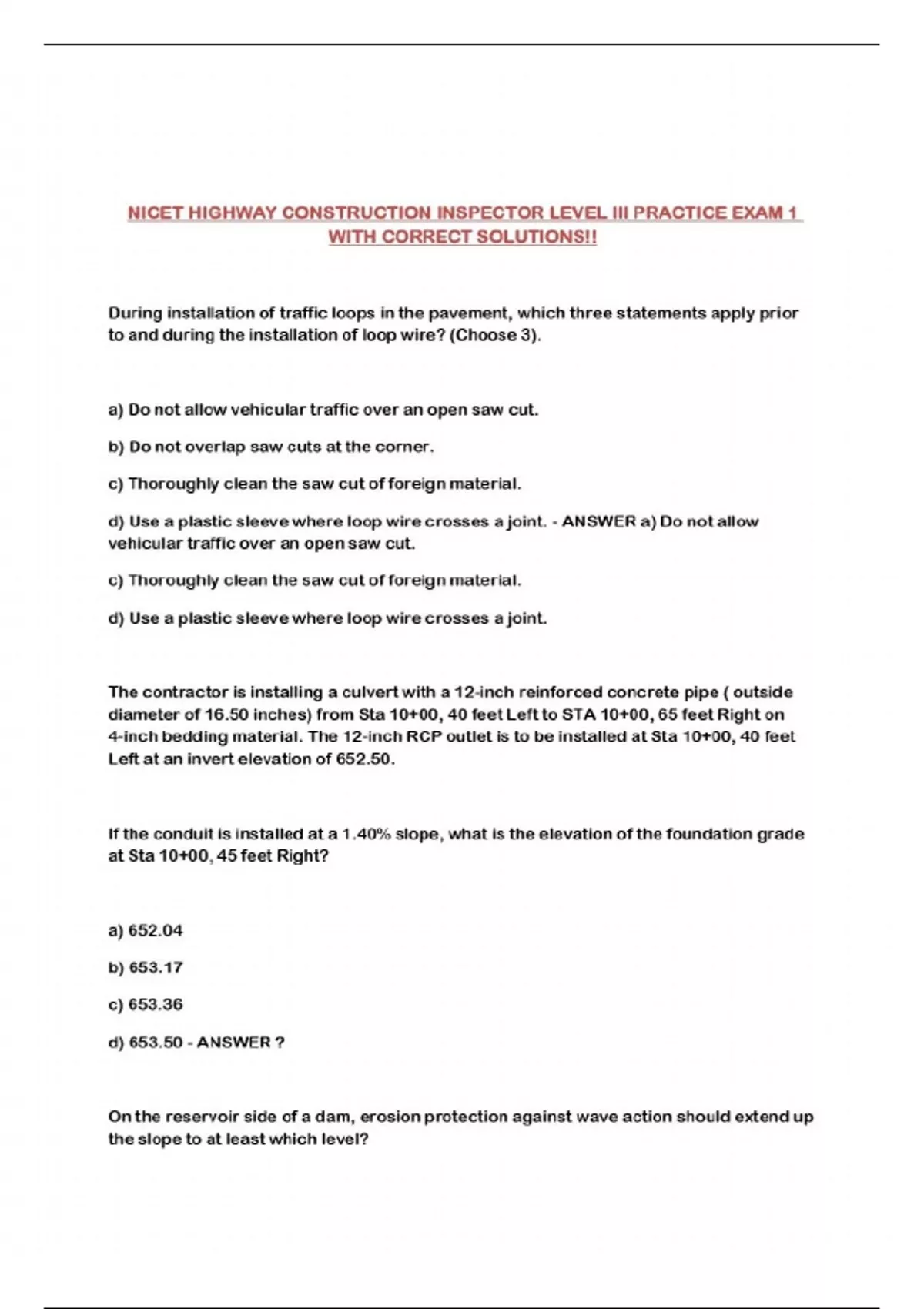 NICET HIGHWAY CONSTRUCTION INSPECTOR LEVEL III PRACTICE EXAM 1 WITH CORRECT SOLUTIONS!!...