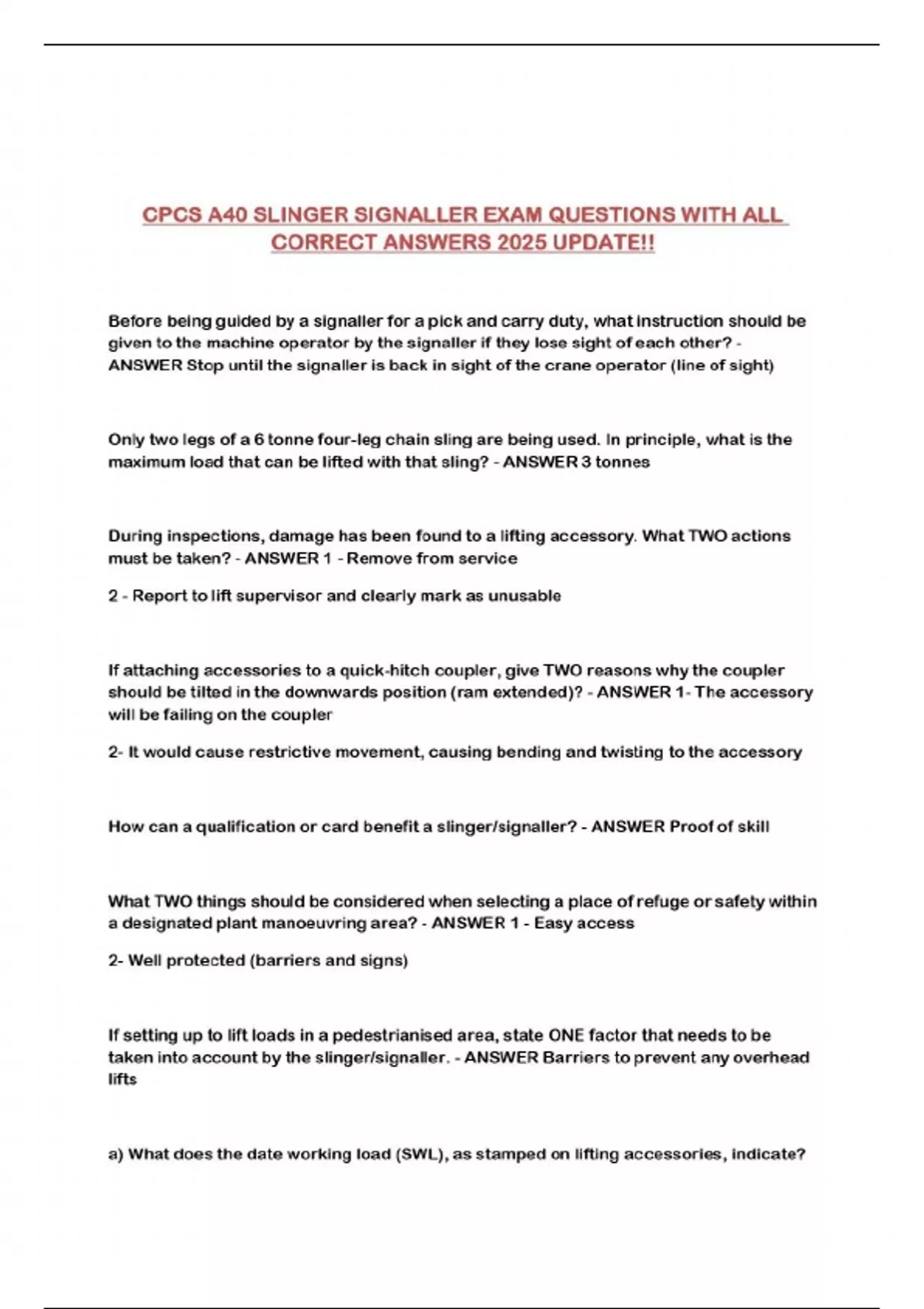 CPCS A40 SLINGER SIGNALLER EXAM QUESTIONS WITH ALL CORRECT ANSWERS 2025 UPDATE!!...