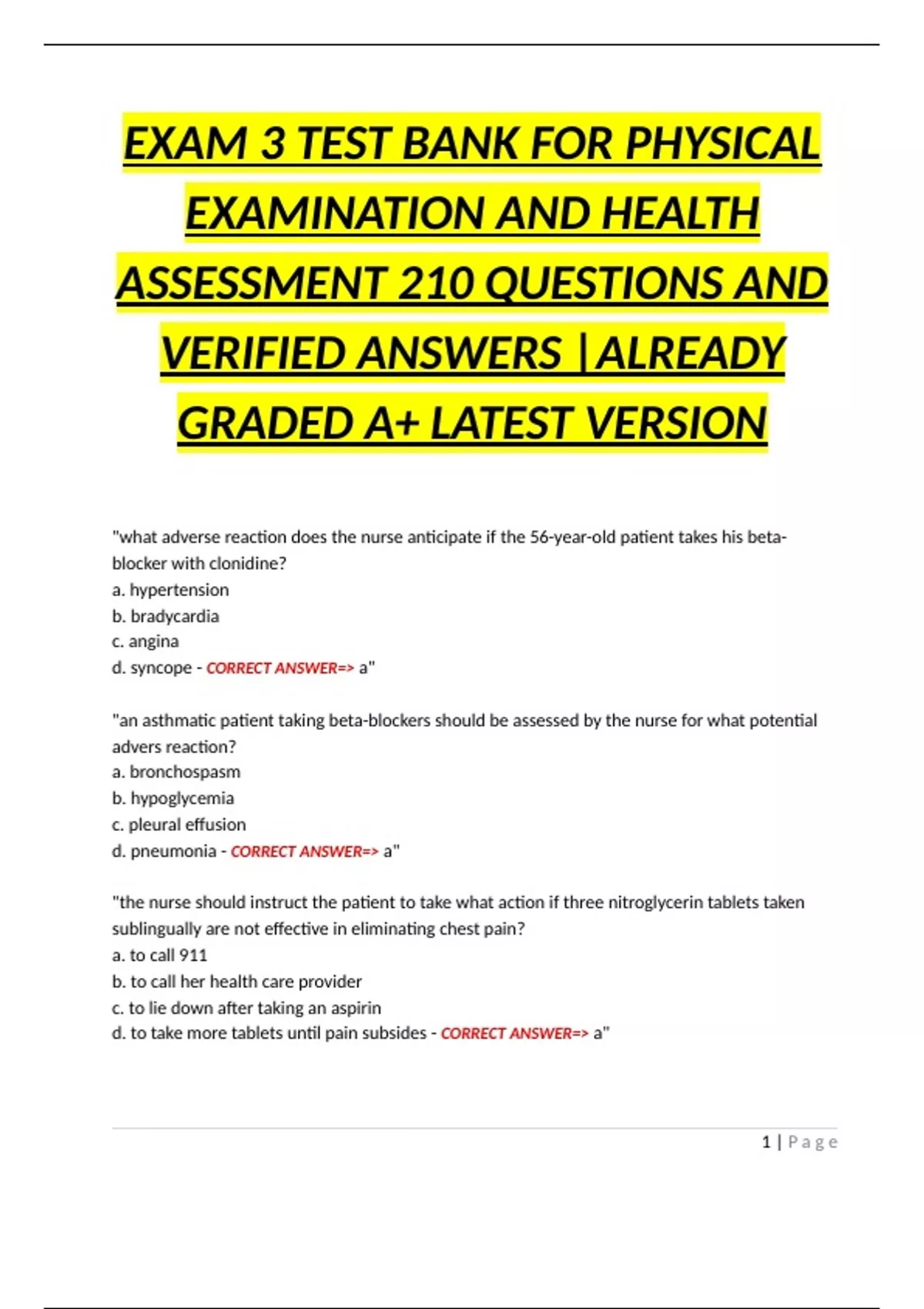 EXAM 3 TEST BANK FOR PHYSICAL EXAMINATION AND HEALTH ASSESSMENT 210 QUESTIONS AND VERIFIED ANSWERS |ALREADY GRADED A+ LATEST VERSION