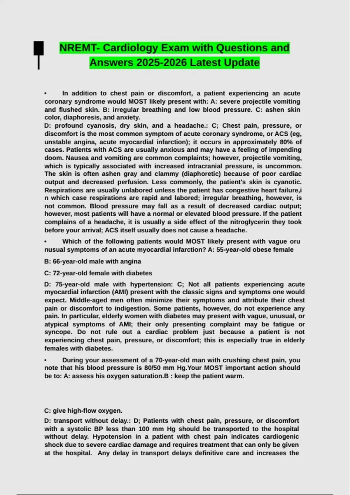 NREMT- Cardiology Exam with Questions and