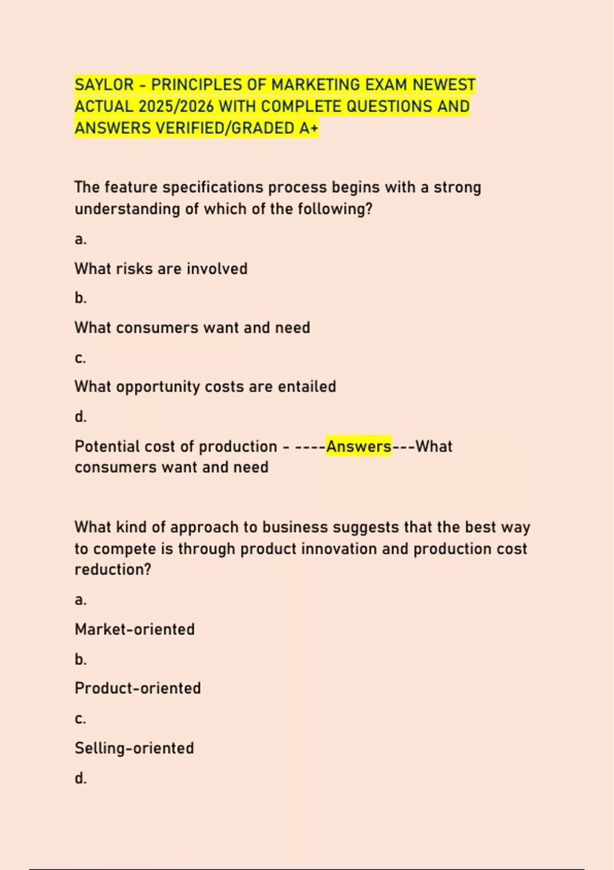 SAYLOR - PRINCIPLES OF MARKETING EXAM NEWEST ACTUAL 2025/2026 WITH COMPLETE QUESTIONS AND ANSWERS VERIFIED/GRADED A+