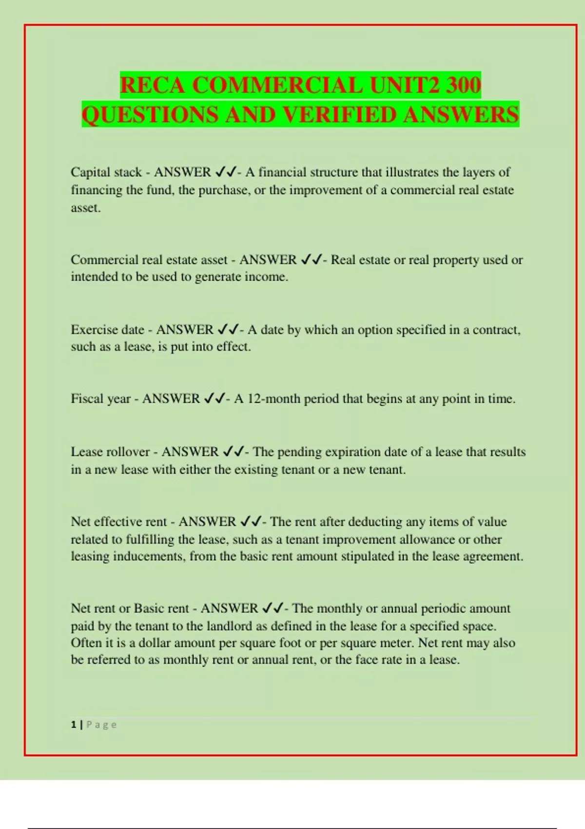 Net rent or Basic rent - ANSWER ✔✔- The monthly or annual periodic amount