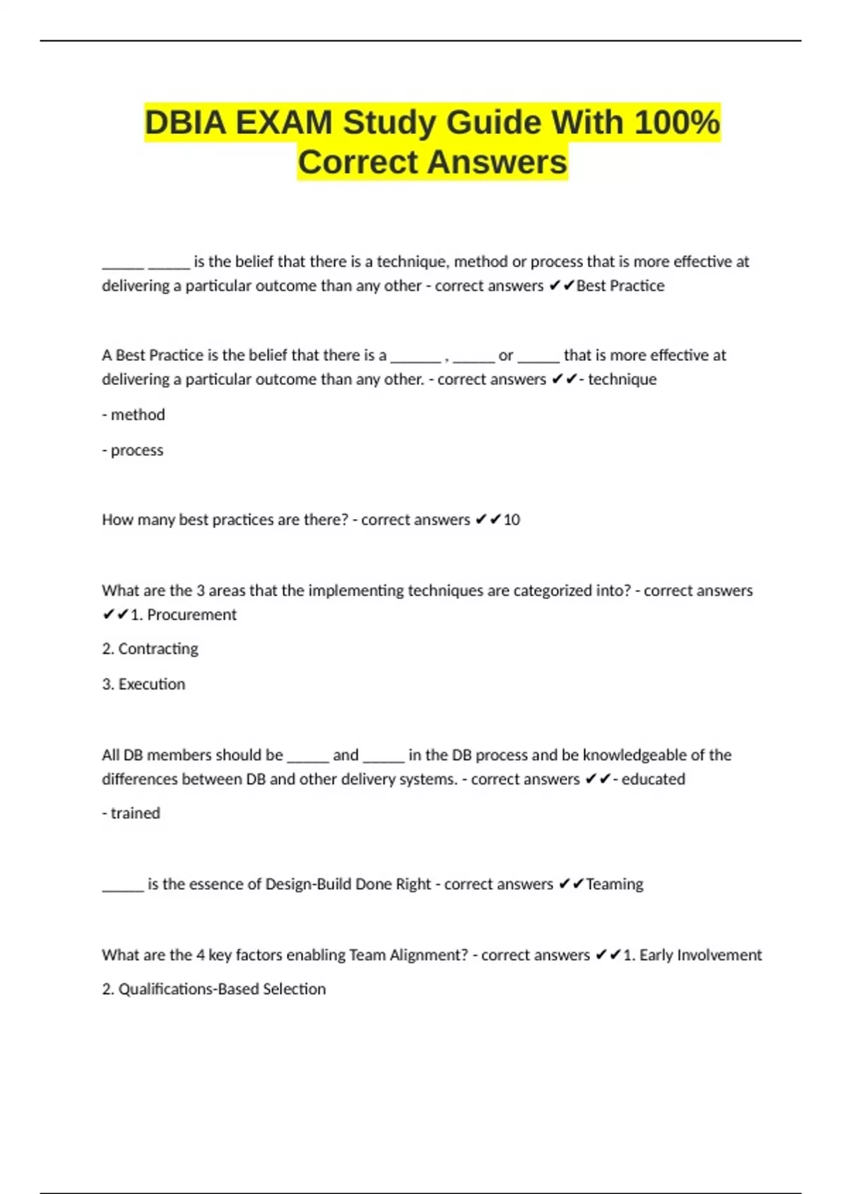 _____ _____ is the belief that there is a technique, method or process that is more effective at delivering a particular outcome than any other - correct answers Best Practice A Best Practice is the belief that there is a ______ , _____ or _____ that is more effective at delivering a particular outcome than any other. - correct answers - technique - method - process How many best practices are there? - correct answers 10 What are the 3 areas that the implementing techniques are categorized into? - correct answers 1. Procurement 2. Contracting 3. Execution All DB members should be _____ and _____ in the DB process and be knowledgeable of the differences between DB and other delivery systems. - correct answers - educated - trained _____ is the essence of Design-Build Done Right - correct answers Teaming What are the 4 key factors enabling Team Alignment? - correct answers 1. Early