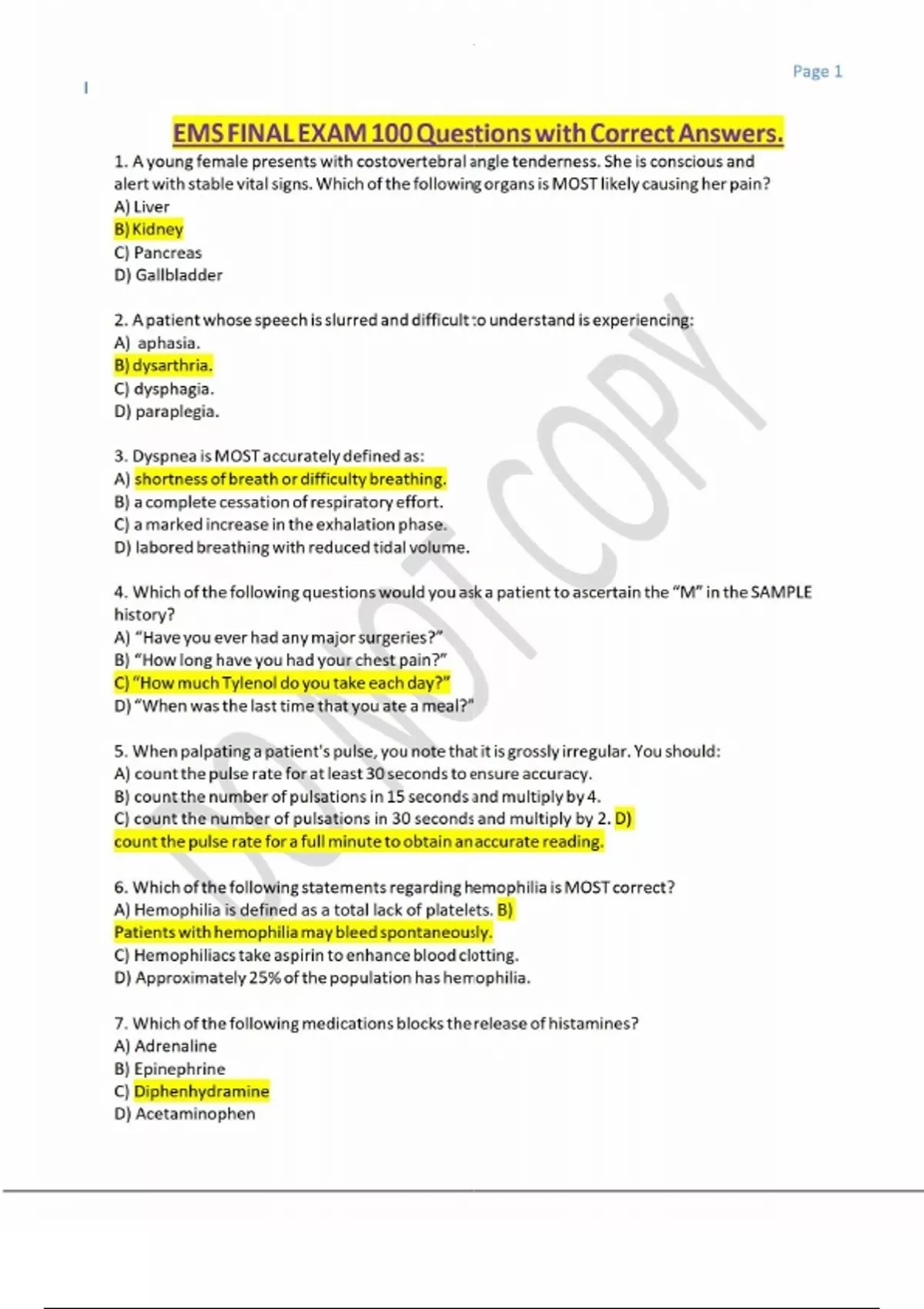 EMS FINAL EXAM 100 Questions with Correct Answers.