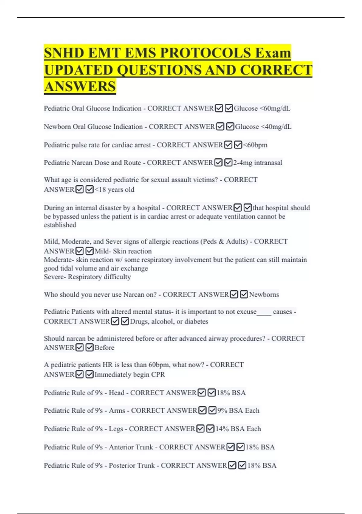 SNHD EMT EMS PROTOCOLS Exam UPDATED QUESTIONS AND CORRECT ANSWERS Pediatric Oral Glucose Indication - CORRECT ANSWERGlucose <60mg/dL Newborn Oral Glucose Indication - CORRECT ANSWERGlucose <40mg/dL Pediatric pulse rate for cardiac arrest - CORRECT ANSWER<60bpm Pediatric Narcan Dose and Route - CORRECT ANSWER2-4mg intranasal What age is considered pediatric for sexual assault victims? - CORRECT ANSWER<18 years old During an internal disaster by a hospital - CORRECT ANSWERthat hospital should be bypassed unless the patient is in cardiac arrest or adequate ventilation cannot be established Mild, Moderate, and Sever signs of allergic reactions (Peds & Adults) - CORRECT ANSWERMild- Skin reaction Moderate- skin reaction w/ some respiratory involvement but the patient can still maintain good tidal volume and air exchange Severe- Respiratory difficulty