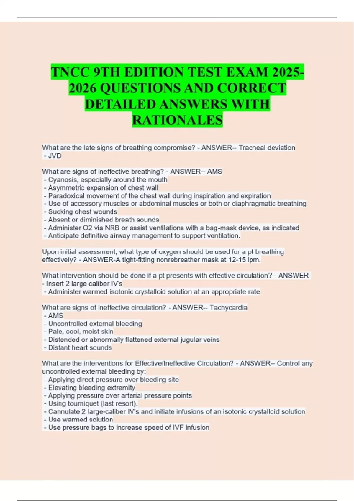 TNCC 9TH EDITION TEST EXAM QUESTIONS AND CORRECT DETAILED ANSWERS WITH RATIONALES What are the late signs of breathing compromise? - ANSWER-- Tracheal deviation - JVD What are signs of ineffective breathing? - ANSWER-- AMS - Cyanosis, especially around the mouth - Asymmetric expansion of chest wall - Paradoxical movement of the chest wall during inspiration and expiration - Use of accessory muscles or abdominal muscles or both or diaphragmatic breathing - Sucking chest wounds - Absent or diminished breath sounds - Administer O2 via NRB or assist ventilations with a bag-mask device, as indicated - Anticipate definitive airway management to support ventilation. Upon initial assessment, what type of oxygen should be used for a pt breathing effectively? - ANSWER-A tight-fitting nonrebreather mask at 12-15 lpm. What intervention should be done if a pt presents with effective circulation? - ANSWER-- Insert 2 large caliber IV's - Administer warmed isotonic crystalloid solution at an appropriate rate What are signs of ineffective circulation? - ANSWER-- Tachycardia - AMS - Uncontrolled external bleeding - Pale, cool, moist skin - Distended or abnormally flattened external jugular veins - Distant heart sounds What are the interventions for Effective/Ineffective Circulation? - ANSWER-- Control any uncontrolled external bleeding by: - Applying direct pressure over bleeding site - Elevating bleeding extremity - Applying pressure over arterial pressure points - Using tourniquet (last resort). - Cannulate 2 large-caliber IV's and initiate infusions of an isotonic crystalloid solution - Use warmed solution - Use pressure bags to increase speed of IVF infusion - Use blood administration tubing for possible administration of blood - Use rapid infusion device based on protocol - Use NS 0.9% in same tubing as blood product - IV = surgical cut-down, central line, or both. - Blood sample to determine ABO and Rh group - IO in sternum, legs, arms or pelvis - Administer blood products - PASG (without interfering with fluid resuscitation) What are factors that contribute to ineffective ventilation? - ANSWER-- AMS - LOC - Neurologic injury - Spinal Cord Injury - Intracranial Injury - Blunt trauma - Pain caused by rib fractures - Penetrating Trauma - Preexisting hx of respiratory diseases - Increased age What medications are used during intubation? - ANSWER-LOAD Mnemonic: L = Lidocaine O = Opioids A = Atropine D = Defasciculating agents What are the Rapid Sequence Intubation Steps? - ANSWER-PREPARATION: - gather equipment, staffing, etc. PREOXYGENATION: - Use 100% O2 (prevent risk of aspiration). PRETREATMENT: - Decrease S/E's of intubation PARALYSIS WITH INDUCTION: - Pt has LOC, then administer neuromuscular blocking agent PROTECTION AND POSITIONING: - Apply pressure over cricoid cartilage (minimizes likelihood of vomiting and aspiration PLACEMENT WITH PROOF - Each attempt NOT to exceed 30 seconds, max of 3 attempts. Ventilate pt 30-60 seconds between attempts. - After intubation, inflate the cuff - Confirm tube placement w/exhaled CO2 detector. POSTINTUBATION MANAGEMENT: - Secure ET tube - Set ventilator settings - Obtain Chest x-ray - Continue to medicate continues...