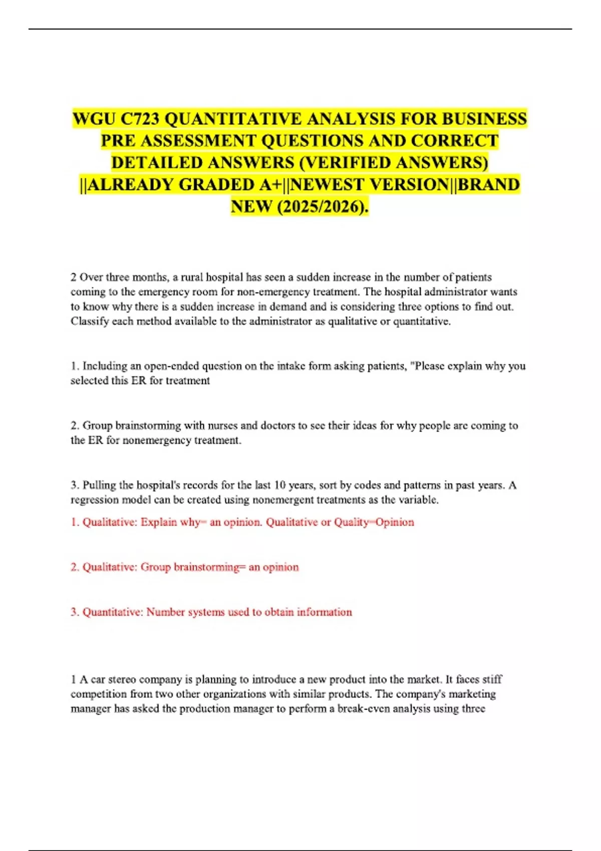 WGU C723 QUANTITATIVE ANALYSIS FOR BUSINESS PRE ASSESSMENT QUESTIONS AND CORRECT DETAILED ANSWERS (VERIFIED ANSWERS) ||ALREADY GRADED A+||NEWEST VERSION||BRAND NEW (2025/2026).