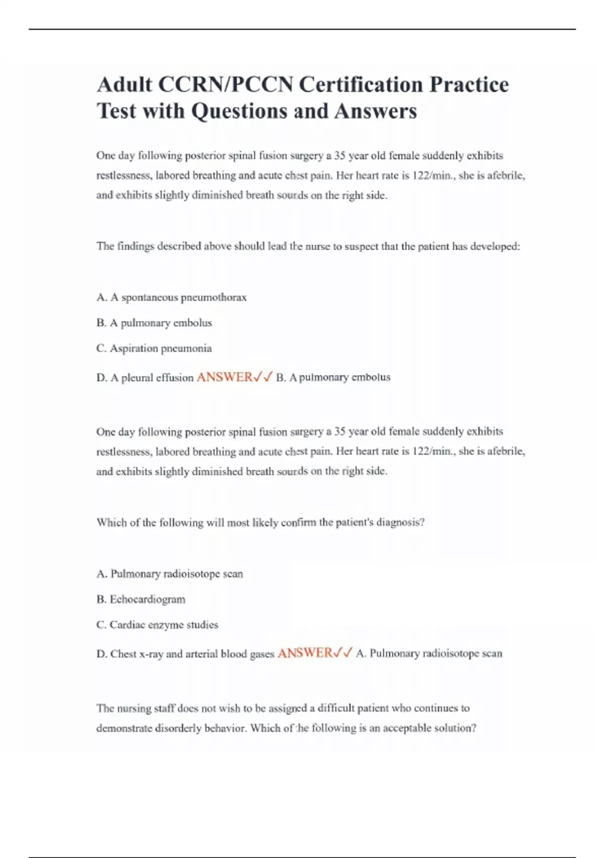 Adult CCRN/PCCN Certification Practice Test with Questions and Answers One day following posterior spinal fusion surgery a 35 year old female suddenly exhibits restlessness, labored breathing and acute chest pain. Her heart rate is 122/min., she is afebrile, and exhibits slightly diminished breath sounds on the right side. The findings described above should lead the nurse to suspect that the patient has developed: A. A spontaneous pneumothorax B. A pulmonary embolus C. Aspiration pneumonia D. A pleural effusion ANSWER B. A pulmonary embolus One day following posterior spinal fusion surgery a 35 year old female suddenly exhibits restlessness, labored breathing and acute chest pain. Her heart rate is 122/min., she is afebrile, and exhibits slightly diminished breath sounds on the right side. Which of the following will most likely confirm the patient's diagnosis? A. Pulmonary radioisotope scan B. Echocardiogram C. Cardiac enzyme studies D. Chest x-ray and arterial blood gases ANSWER A. Pulmonary radioisotope scan The nursing staff does not wish to be assigned a difficult patient who continues to demonstrate disorderly behavior. Which of the following is an acceptable solution?