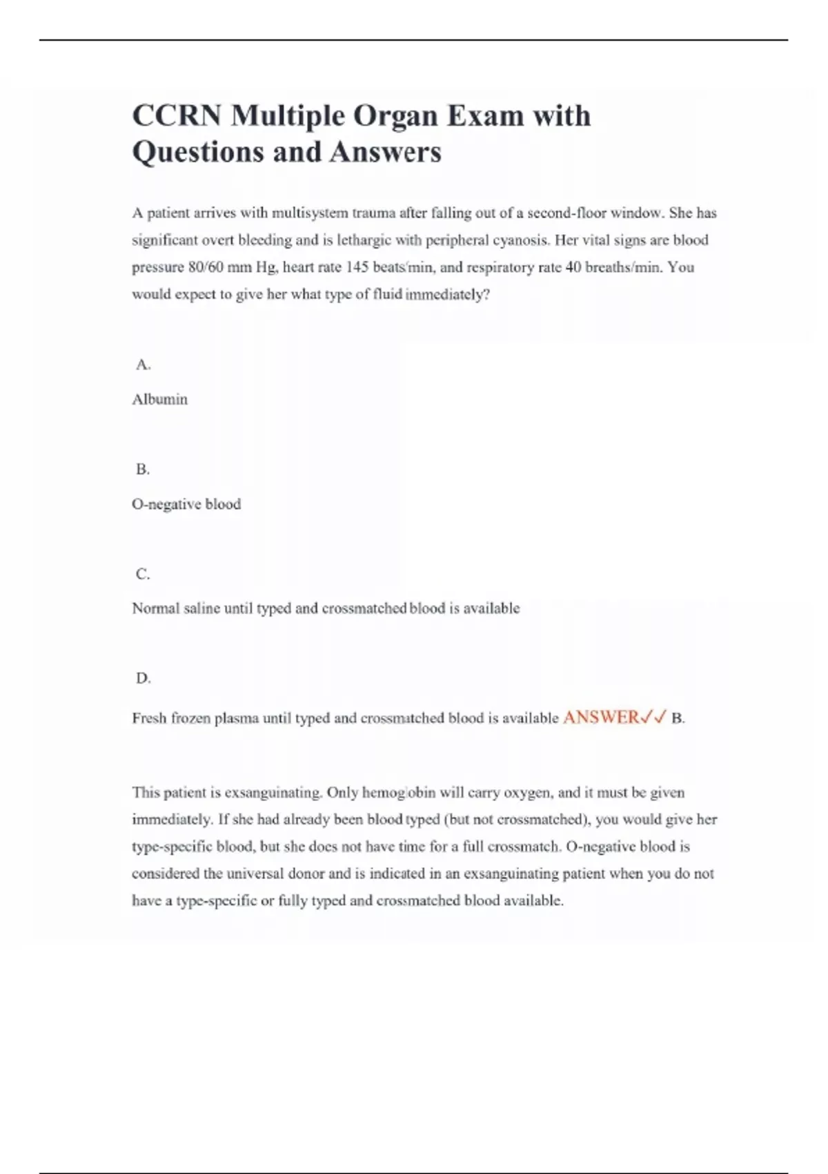 CCRN Multiple Organ Exam with Questions and Answers A patient arrives with multisystem trauma after falling out of a second-floor window. She has significant overt bleeding and is lethargic with peripheral cyanosis. Her vital signs are blood pressure 80/60 mm Hg, heart rate 145 beats/min, and respiratory rate 40 breaths/min. You would expect to give her what type of fluid immediately? A. Albumin B. O-negative blood C. Normal saline until typed and crossmatched blood is available D. Fresh frozen plasma until typed and crossmatched blood is available ANSWER B. This patient is exsanguinating. Only hemoglobin will carry oxygen, and it must be given immediately. If she had already been blood typed (but not crossmatched), you would give her type-specific blood, but she does not have time for a full crossmatch. O-negative blood is considered the universal donor and is indicated in an exsanguinating patient when you do not have a type-specific or fully typed and crossmatched blood available. The patient is losing blood, so consider that you need to replace what is lost. Best would be fully typed and crossmatched blood. Next best would be type-specific. Next best would be universal donor (O negative) blood.