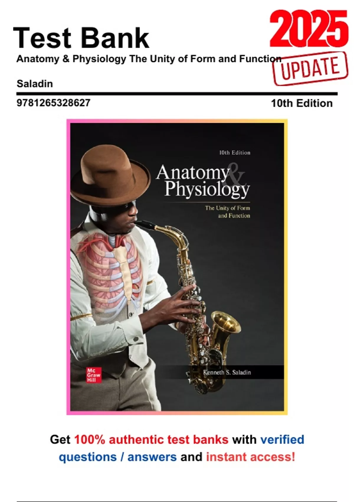 Test Bank: Anatomy & Physiology The Unity of Form and Function 10th Edition by Saladin - Ch. 1-29, 9781265328627, with Rationales
