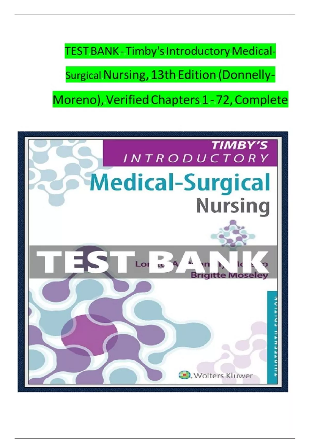 INTRODUCTORY MEDICAL-SURGICAL NURSING 13TH EDITION BY TIMBY SMITH TEST BANK ISBN-978-1975172237 Latest Verified Review 2023 Practice Questions and Answers for Exam Preparation, 100% Correct with Explanations, Highly Recommended, Download to Score A+ Introductory Medical-Surgical Nursing 13th Edition By Timby Smith Test Bank TABLE OF CONTENTS: Chapter 01: Concepts and Trends in Healthcare 1 Chapter 02: Settings and Models for Nursing Care 18 Chapter 03: The Nursing Process, NCLEX-Style 34 Chapter 04: Interviewing and Physical Assessment 48 Chapter 05: Legal and Ethical Issues 62 Chapter 06: Leadership Roles and Management Functions 78 Chapter 07: Nurse–Client Relationships 91 Chapter 08: Cultural Care Considerations 106 Chapter 09: Integrative Medicine and Alternative Therapies 117 Chapter 10: End-of-Life Care 129 Chapter 11: Pain Management 142 Chapter 12: Infection 157 Chapter 13: Intravenous Therapy 173 Chapter 14: Perioperative Care 186 Chapter 15: Disaster Situations 201 Chapter 16: Caring for Clients With Fluid, Electrolyte, and Acid-Base Imbalances 214 Chapter 17: Caring for Clients in Shock 228 Chapter 18: Caring for Clients With Cancer 242 Chapter 19: Introduction to the Respiratory System 260 Chapter 20: Caring for Clients With Upper Respiratory Disorders 276 Chapter 21: Caring for Clients With Lower Respiratory Disorders 291 Chapter 22: Introduction to the Cardiovascular System 304 Chapter 23: Caring for Clients With Infectious and Inflammatory Disorders of the Heart and Blood Vessels 316 Chapter 24: Caring for Clients With Valvular Disorders of the Heart 328 Chapter 25: Caring for Clients With Disorders of Coronary and Peripheral Blood Vessels 341 Chapter 26: Caring for Clients With Cardiac Arrhythmias 354 Chapter 27: Caring for Clients With Hypertension 367 Chapter 28: Caring for Clients With Heart Failure 380 Chapter 29: Caring for Clients Undergoing Cardiovascular Surgery 394 Chapter 30: Introduction to the Hematopoietic and Lymphatic Systems 410 Chapter 31: Caring for Clients With Disorders of the Hematopoietic System 423 Chapter 32: Caring for Clients With Disorders of the Lymphatic System 439 Chapter 33: Introduction to the Immune System 455 Chapter 34: Caring for Clients With Immune-Mediated Disorders 471 Chapter 35: Caring for Clients With HIV/ AIDS 487 Chapter 36: Introduction to the Nervous System 504 Chapter 37: Caring for Clients With Central and Peripheral Nervous System Disorders 518 Chapter 38: Caring for Clients With Cerebrovascular Disorders 532 Chapter 39: Caring for Clients With Head and Spinal Cord Trauma 546 Chapter 40: Caring for Clients With Neurologic Deficits 561 Chapter 41: Introduction to the Sensory System 576 Chapter 42: Caring for Clients With Eye Disorders 588 Chapter 43: Caring for Clients With Ear Disorders 599 Introductory Medical-Surgical Nursing 13th Edition By Timby Smith Test Bank Chapter 44: Introduction to the Gastrointestinal System and Accessory Structures 613 Chapter 45: Caring for Clients With Disorders of the Upper Gastrointestinal Tract 626 Chapter 46: Caring for Clients With Disorders of the Lower Gastrointestinal Tract 641 Chapter 47: Caring for Clients With Disorders of the Liver, Gallbladder, or Pancreas 655 Chapter 48: Caring for Clients With Ostomies 667 Chapter 49: Introduction to the Endocrine System 682 Chapter 50: Caring for Clients With Disorders of the Endocrine System 694 Chapter 51: Caring for Clients With Diabetes Mellitus 708 Chapter