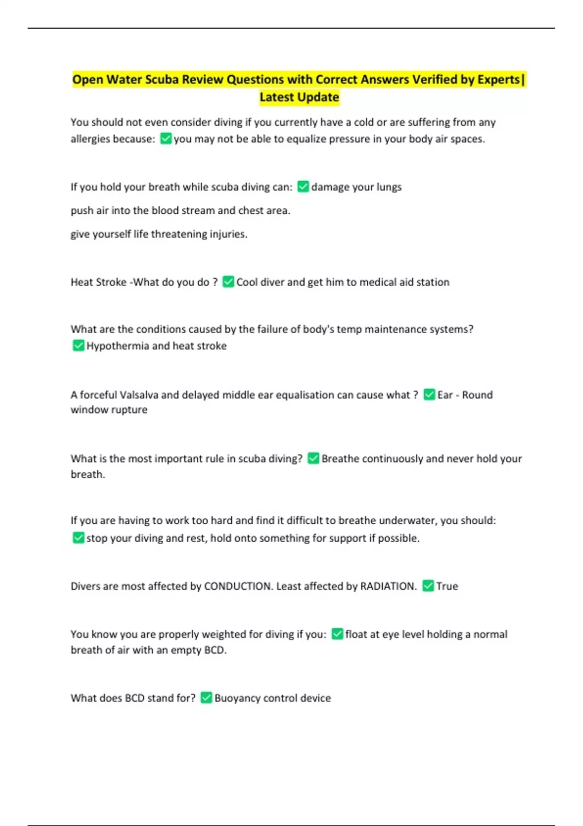 Open Water Scuba Review Questions with Correct Answers Verified by Experts| Latest Update