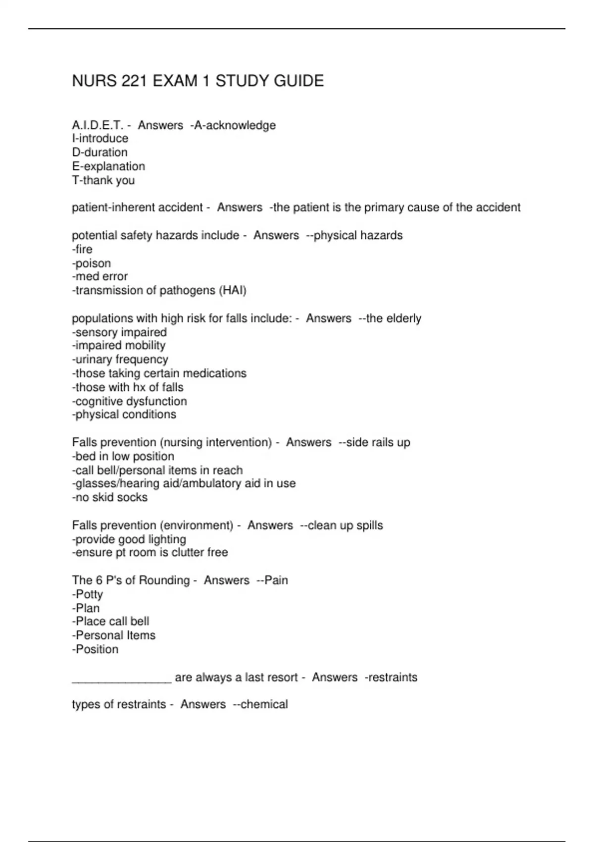 NURS 221 EXAM 1 STUDY GUIDE