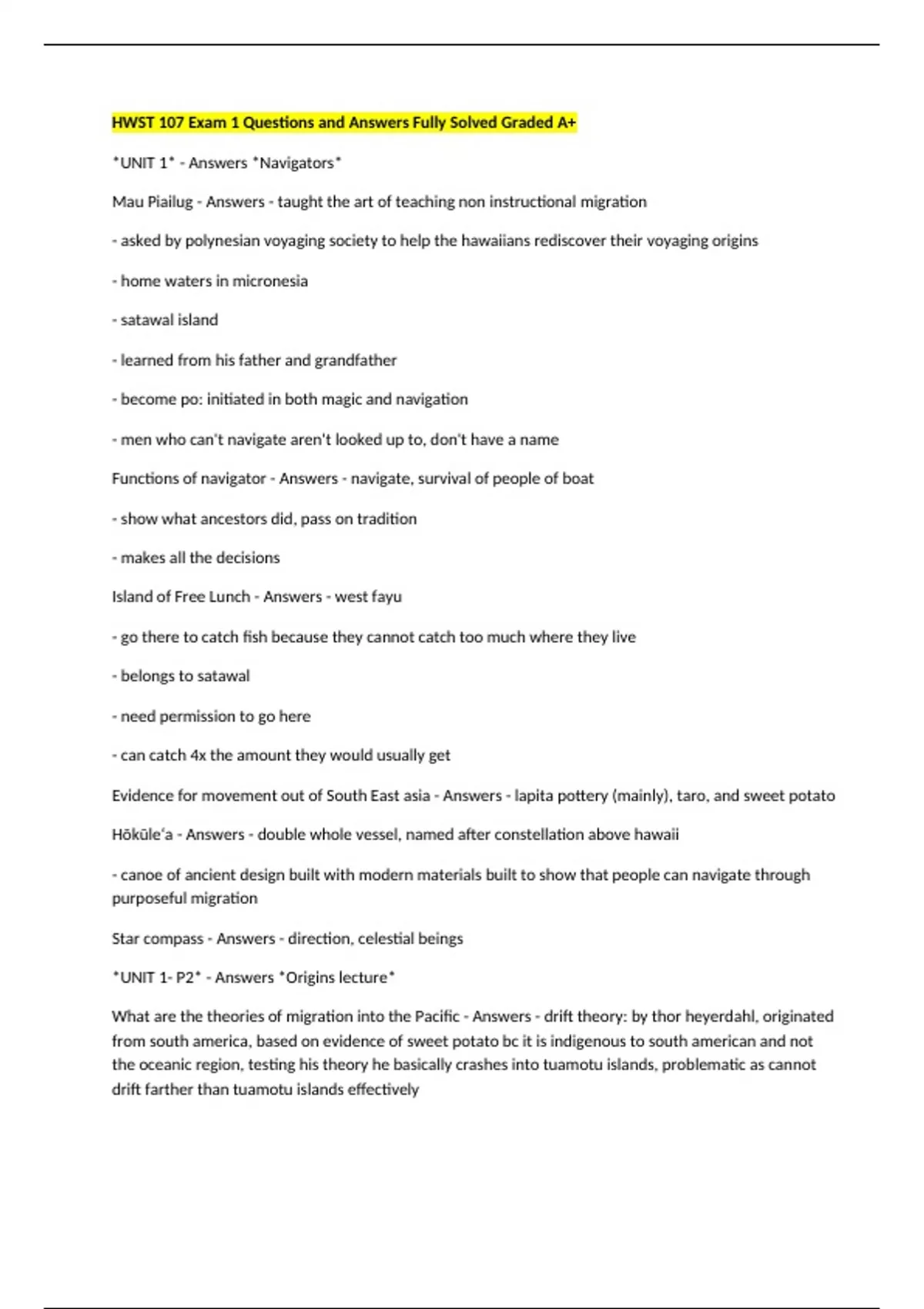 HWST 107 Exam 1 Questions and Answers Fully Solved Graded A+ *UNIT 1* - Answers *Navigators* Mau Piailug - Answers - taught the art of teaching non instructional migration - asked by polynesian voyaging society to help the hawaiians rediscover their voyaging origins - home waters in micronesia - satawal island - learned from his father and grandfather - become po: initiated in both magic and navigation - men who can't navigate aren't looked up to, don't have a name Functions of navigator - Answers - navigate, survival of people of boat - show what ancestors did, pass on tradition - makes all the decisions Island of Free Lunch - Answers - west fayu - go there to catch fish because they cannot catch too much where they live - belongs to satawal - need permission to go here - can catch 4x the amount they would usually get Evidence for movement out of South East asia - Answers - lapita pottery (mainly), taro, and sweet potato Hōkūleʻa - Answers - double whole vessel, named after constellation above hawaii - canoe of ancient design built with modern materials built to show that people can navigate through purposeful migration Star compass - Answers - direction, celestial beings *UNIT 1- P2* - Answers *Origins lecture* What are the theories of migration into the Pacific - Answers - drift theory: by thor heyerdahl, originated from south america, based on evidence of sweet potato bc it is indigenous to south american and not the oceanic region, testing his theory he basically crashes into tuamotu islands, problematic as cannot drift farther than tuamotu islands effectively - way-finding/purposeful navigation: non instrumental navigation How many migrations were there into the Pacific - Answers 2 Sahul - Answers - non-austronesians moved to here Sunda shelf - Answers - non-austronesians originated from here Climatic changes - Answers - sea levels rise - fire caves of naumaga: large house under the sea found an underwater cave more than 40 metros down the wall of a coral cliff *period of glaciation locked away huge volumes of water, sea level to fluctuate 20-45 meters lower than at present Cradle of Polynesian civilization - Answers - tonga and samoa - there 1,000 years Points of the Polynesian triangle - Answers - north point: hawaii - west point: aotearoa - east point: raps nui or easter island Evidence for the various theories of migration - Answers - drift theory: sweet potato - way-finding/purposeful navigation: lapita pottery shows movement eastward out of south east asia, obsidian was purposefully traded for over 700 years, common language and culture, yoshi sinotos findings on island go huahine suggesting a production site of goods for trade, molokai contained similar artifacts found at huahine Austronesian - Answers - second, more extensive migration into oceania - language group - originated fout of south east asia - occurred between 3,000 to 6,000 years ago - movement aided by 3 technologies: