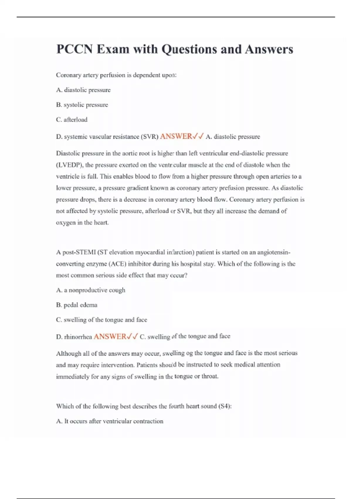 PCCN Exam with Questions and Answers Coronary artery perfusion is dependent upon: A. diastolic pressure B. systolic pressure C. afterload D. systemic vascular resistance (SVR) ANSWER A. diastolic pressure Diastolic pressure in the aortic root is higher than left ventricular end-diastolic pressure (LVEDP), the pressure exerted on the ventricular muscle at the end of diastole when the ventricle is full. This enables blood to flow from a higher pressure through open arteries to a lower pressure, a pressure gradient known as coronary artery prefusion pressure. As diastolic pressure drops, there is a decrease in coronary artery blood flow. Coronary artery perfusion is not affected by systolic pressure, afterload or SVR, but they all increase the demand of oxygen in the heart. A post-STEMI (ST elevation myocardial infarction) patient is started on an angiotensin-converting enzyme (ACE) inhibitor during his hospital stay. Which of the following is the most common serious side effect that may occur? A. a nonproductive cough B. pedal edema C. swelling of the tongue and face D. rhinorrhea ANSWER C. swelling of the tongue and face Although all of the answers may occur, swelling og the tongue and face is the most serious and may require intervention. Patients should be instructed to seek medical attention immediately for any signs of swelling in the tongue or throat. Which of the following best describes the fourth heart sound (S4): A. It occurs after ventricular contraction