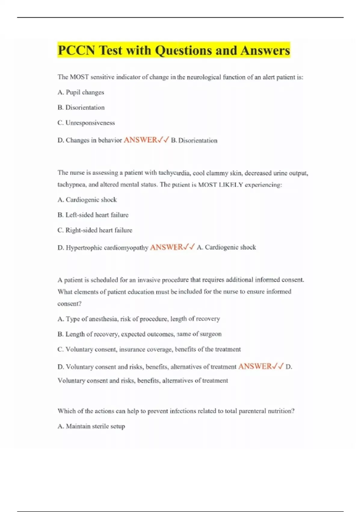PCCN Test with Questions and Answers The MOST sensitive indicator of change in the neurological function of an alert patient is: A. Pupil changes B. Disorientation C. Unresponsiveness D. Changes in behavior ANSWER B. Disorientation The nurse is assessing a patient with tachycardia, cool clammy skin, decreased urine output, tachypnea, and altered mental status. The patient is MOST LIKELY experiencing: A. Cardiogenic shock B. Left-sided heart failure C. Right-sided heart failure D. Hypertrophic cardiomyopathy ANSWER A. Cardiogenic shock A patient is scheduled for an invasive procedure that requires additional informed consent. What elements of patient education must be included for the nurse to ensure informed consent? A. Type of anesthesia, risk of procedure, length of recovery B. Length of recovery, expected outcomes, name of surgeon C. Voluntary consent, insurance coverage, benefits of the treatment D. Voluntary consent and risks, benefits, alternatives of treatment ANSWER D. Voluntary consent and risks, benefits, alternatives of treatment Which of the actions can help to prevent infections related to total parenteral nutrition? A. Maintain sterile setup