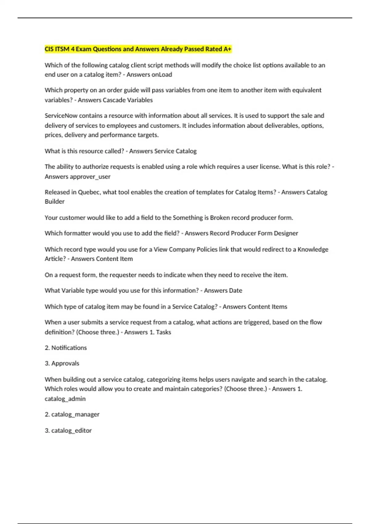 CIS ITSM 4 Exam Questions and Answers Already Passed Rated A+ Which of the following catalog client script methods will modify the choice list options available to an end user on a catalog item? - Answers onLoad Which property on an order guide will pass variables from one item to another item with equivalent variables? - Answers Cascade Variables ServiceNow contains a resource with information about all services. It is used to support the sale and delivery of services to employees and customers. It includes information about deliverables, options, prices, delivery and performance targets. What is this resource called? - Answers Service Catalog The ability to authorize requests is enabled using a role which requires a user license. What is this role? - Answers approver_user Released in Quebec, what tool enables the creation of templates for Catalog Items? - Answers Catalog Builder Your customer would like to add a field to the Something is Broken record producer form. Which formatter would you use to add the field? - Answers Record Producer Form Designer Which record type would you use for a View Company Policies link that would redirect to a Knowledge Article? - Answers Content Item On a request form, the requester needs to indicate when they need to receive the item. What Variable type would you use for this information? - Answers Date Which type of catalog item may be found in a Service Catalog? - Answers Content Items When a user submits a service request from a catalog, what actions are triggered, based on the flow definition? (Choose three.) - Answers 1. Tasks 2. Notifications 3. Approvals When building out a service catalog, categorizing items helps users navigate and search in the catalog. Which roles would allow you to create and maintain categories? (Choose three.) - Answers 1. catalog_admin 2. catalog_manager 3. catalog_editor When defining SLAs for the service catalog, at what level is the SLA typically defined? - Answers Requested Item What functionality can be used to define the sequence of activities that should be taken to complete catalog items? (Choose two.) - Answers 1. Workflow 2. Flow Your customer wants to limit the users who are able to see internal Network requests, to members of the Network department. Which roles would enable you to make these required changes? (Choose two.) - Answers 1. user_criteria_admin 2. catalog_admin What should you use to capture data in a grid layout on a catalog item? - Answers Multi-row variable set From a data model perspective, which table is the base class for the configuration management database? - Answers Base Configuration Item [cmdb] Which role has the ability to configure and manage Incident Management properties? - Answers incident_manager Which of the following options can a survey administrator define on an individual survey? (Choose two.) - Answers 1. Trigger Conditions 2. Anonymize responses How do you define the content that is tracked and displayed in all Incident record activity