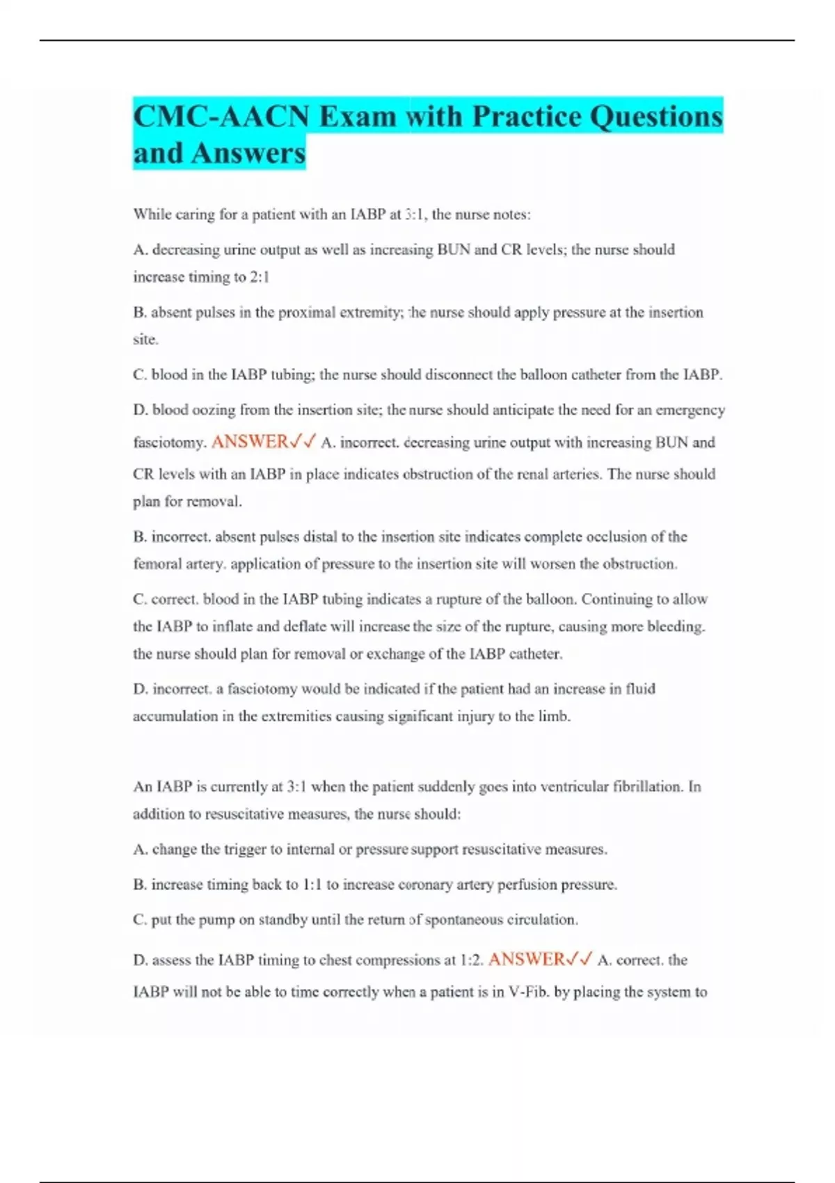 CMC-AACN Exam with Practice Questions and Answers While caring for a patient with an IABP at 3:1, the nurse notes: A. decreasing urine output as well as increasing BUN and CR levels; the nurse should increase timing to 2:1 B. absent pulses in the proximal extremity; the nurse should apply pressure at the insertion site. C. blood in the IABP tubing; the nurse should disconnect the balloon catheter from the IABP. D. blood oozing from the insertion site; the nurse should anticipate the need for an emergency fasciotomy. ANSWER A. incorrect. decreasing urine output with increasing BUN and CR levels with an IABP in place indicates obstruction of the renal arteries. The nurse should plan for removal. B. incorrect. absent pulses distal to the insertion site indicates complete occlusion of the femoral artery. application of pressure to the insertion site will worsen the obstruction. C. correct. blood in the IABP tubing indicates a rupture of the balloon. Continuing to allow the IABP to inflate and deflate will increase the size of the rupture, causing more bleeding. the nurse should plan for removal or exchange of the IABP catheter. D. incorrect. a fasciotomy would be indicated if the patient had an increase in fluid accumulation in the extremities causing significant injury to the limb. An IABP is currently at 3:1 when the patient suddenly goes into ventricular fibrillation. In addition to resuscitative measures, the nurse should: A. change the trigger to internal or pressure support resuscitative measures. B. increase timing back to 1:1 to increase coronary artery perfusion pressure. C. put the pump on standby until the return of spontaneous circulation. D. assess the IABP timing to chest compressions at 1:2. ANSWER A. correct. the IABP will not be able to time correctly when a patient is in V-Fib. by placing the system to