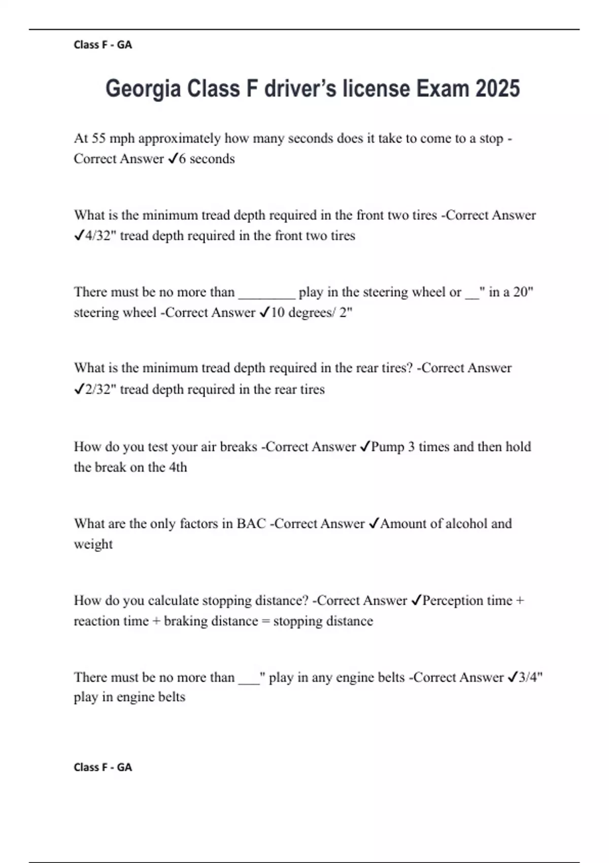 At 55 mph approximately how many seconds does it take to come to a stop -Correct Answer 6 seconds What is the minimum tread depth required in the front two tires -Correct Answer 4/32" tread depth required in the front two tires There must be no more than ________ play in the steering wheel or __" in a 20" steering wheel -Correct Answer 10 degrees/ 2" What is the minimum tread depth required in the rear tires? -Correct Answer 2/32" tread depth required in the rear tires How do you test your air breaks -Correct Answer Pump 3 times and then hold the break on the 4th What are the only factors in BAC -Correct Answer Amount of alcohol and weight How do you calculate stopping distance? -Correct Answer Perception time + reaction time + braking distance = stopping distance There must be no more than ___" play in any engine belts -Correct Answer 3/4" play in engine belts