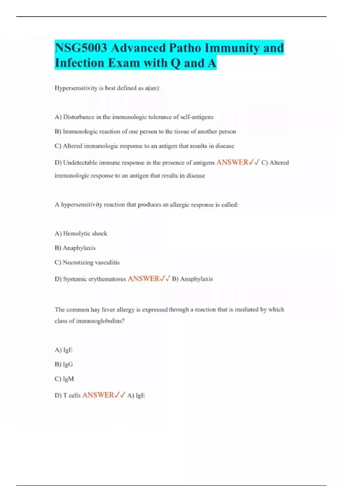 NSG5003 Advanced Patho Immunity and Infection Exam with Q and A Hypersensitivity is best defined as a(an): A) Disturbance in the immunologic tolerance of self-antigens B) Immunologic reaction of one person to the tissue of another person C) Altered immunologic response to an antigen that results in disease D) Undetectable immune response in the presence of antigens ANSWER C) Altered immunologic response to an antigen that results in disease A hypersensitivity reaction that produces an allergic response is called: A) Hemolytic shock B) Anaphylaxis C) Necrotizing vasculitis D) Systemic erythematosus ANSWER B) Anaphylaxis The common hay fever allergy is expressed through a reaction that is mediated by which class of immunoglobulins? A) IgE B) IgG C) IgM D) T cells ANSWER A) IgE