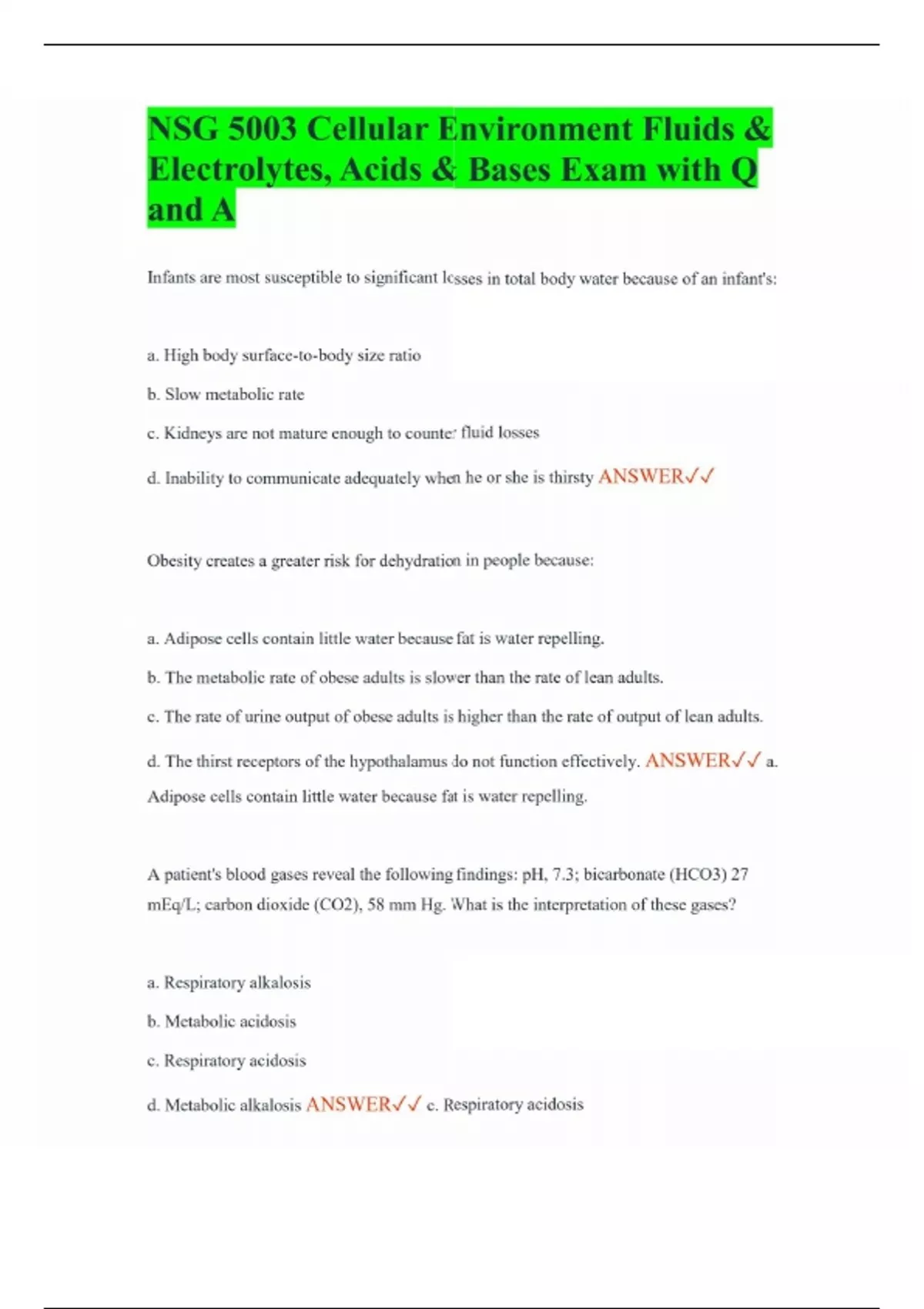 NSG 5003 Cellular Environment Fluids & Electrolytes, Acids & Bases Exam with Q and A Infants are most susceptible to significant losses in total body water because of an infant's: a. High body surface-to-body size ratio b. Slow metabolic rate c. Kidneys are not mature enough to counter fluid losses d. Inability to communicate adequately when he or she is thirsty ANSWER Obesity creates a greater risk for dehydration in people because: a. Adipose cells contain little water because fat is water repelling. b. The metabolic rate of obese adults is slower than the rate of lean adults. c. The rate of urine output of obese adults is higher than the rate of output of lean adults. d. The thirst receptors of the hypothalamus do not function effectively. ANSWER a. Adipose cells contain little water because fat is water repelling. A patient's blood gases reveal the following findings: pH, 7.3; bicarbonate (HCO3) 27 mEq/L; carbon dioxide (CO2), 58 mm Hg. What is the interpretation of these gases? a. Respiratory alkalosis b. Metabolic acidosis c. Respiratory acidosis d. Metabolic alkalosis ANSWER c. Respiratory acidosis