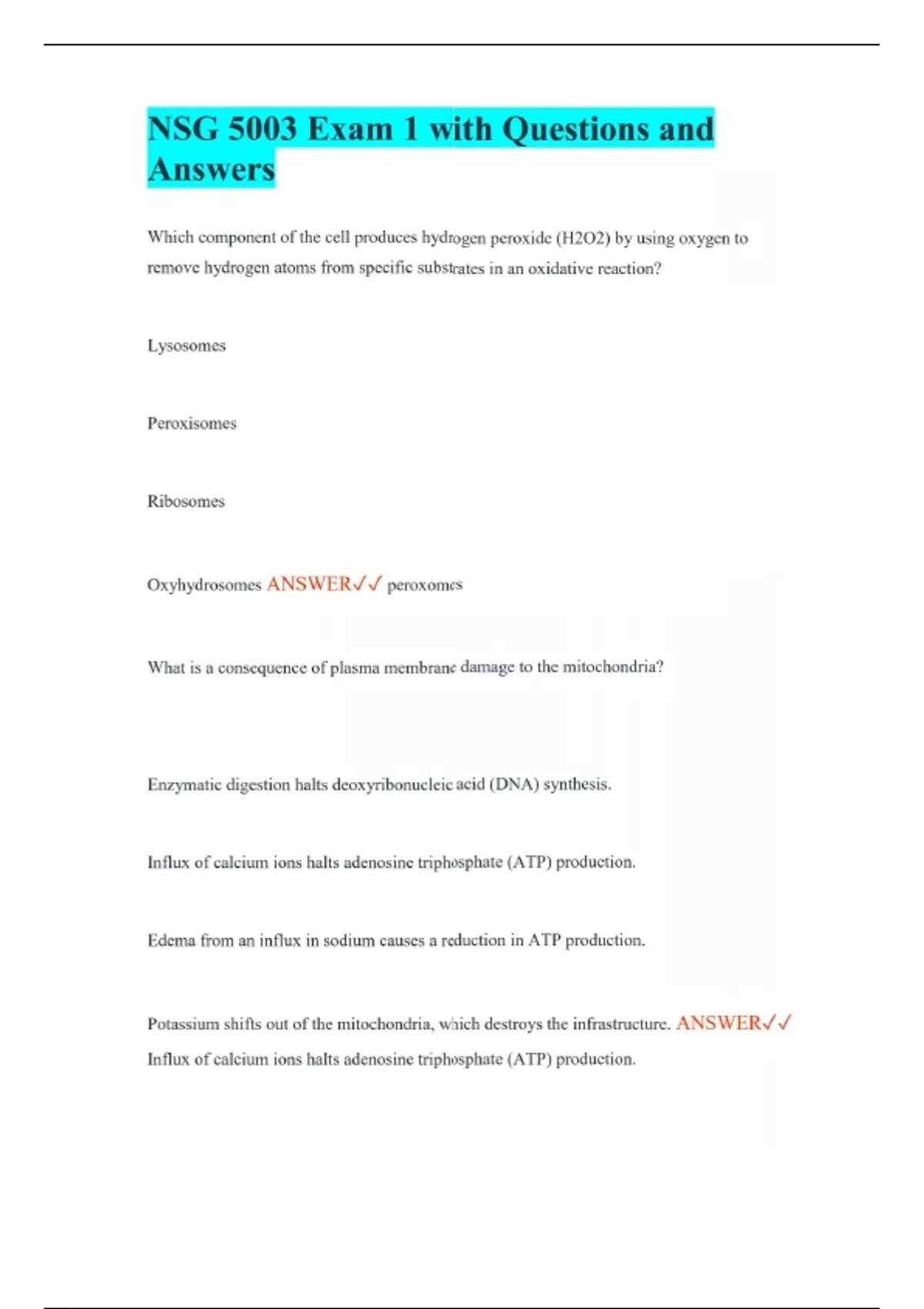 NSG 5003 Exam 1 with Questions and Answers Which component of the cell produces hydrogen peroxide (H2O2) by using oxygen to remove hydrogen atoms from specific substrates in an oxidative reaction? Lysosomes Peroxisomes Ribosomes Oxyhydrosomes ANSWER peroxomes What is a consequence of plasma membrane damage to the mitochondria? Enzymatic digestion halts deoxyribonucleic acid (DNA) synthesis. Influx of calcium ions halts adenosine triphosphate (ATP) production. Edema from an influx in sodium causes a reduction in ATP production. Potassium shifts out of the mitochondria, which destroys the infrastructure. ANSWER Influx of calcium ions halts adenosine triphosphate (ATP) production.