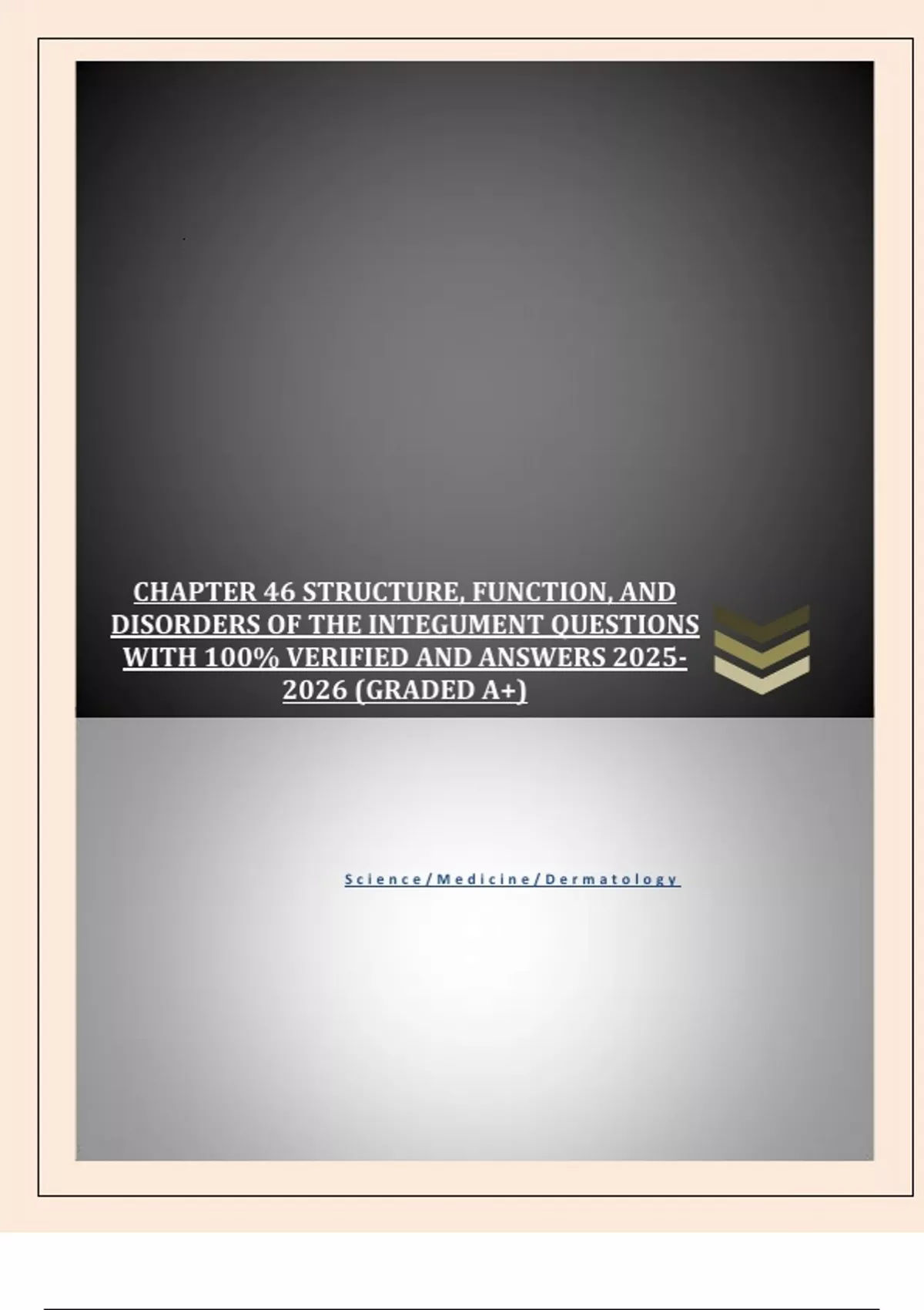 CHAPTER 46 STRUCTURE, FUNCTION, AND DISORDERS OF THE INTEGUMENT QUESTIONS WITH 100% VERIFIED AND ANSWERS (GRADED A+) Lesions on the elbows and knees that are well demarcated, thick, silvery, scaly, and erythematous characterize which type of psoriasis? a. Plaque b. Inverse c. Guttate d. Erythrodermic - CORRECT ANS-a. Plaque Which component of the epidermis initiates immune responses and provides a defense against environmental antigens? a. Langerhans cells b. Merkel cells c. Keratinocytes d. Melanocytes - CORRECT ANS-a. Langerhans cells Which cells of the dermis release histamine and play a role in the hypersensitivity reactions of the skin? Continues...
