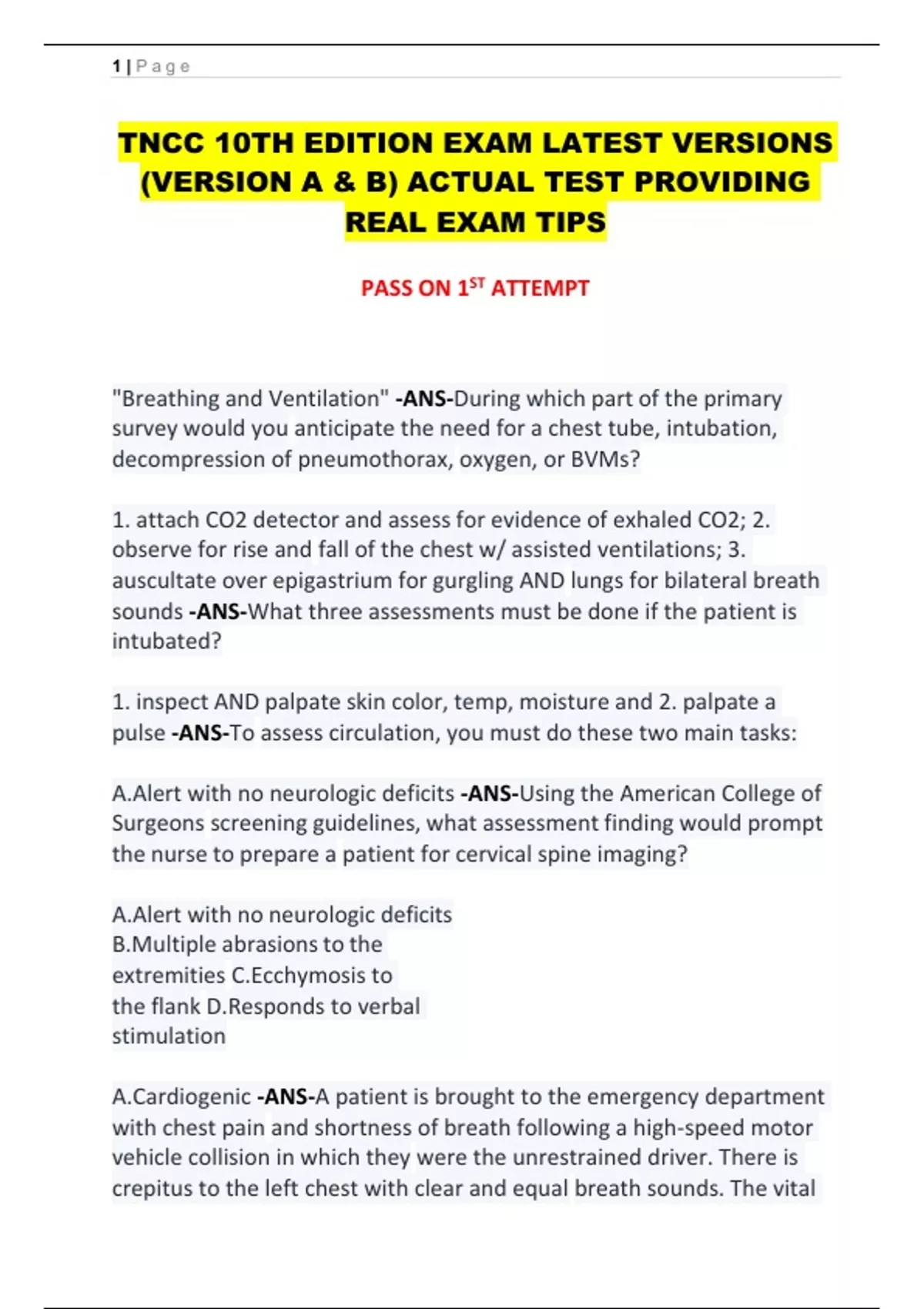 TNCC 10TH EDITION EXAM LATEST VERSIONS (VERSION A & B) ACTUAL TEST PROVIDING REAL EXAM TIPS
