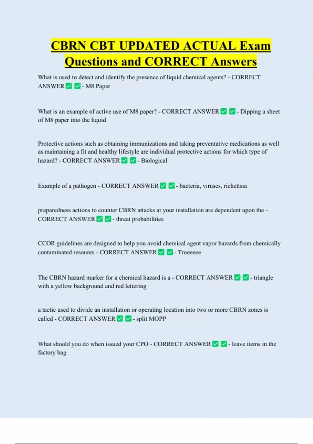 CBRN CBT UPDATED ACTUAL Exam Questions and CORRECT Answers What is used to detect and identify the presence of liquid chemical agents? - CORRECT ANSWER - M8 Paper What is an example of active use of M8 paper? - CORRECT ANSWER of M8 paper into the liquid - Dipping a sheet Protective actions such as obtaining immunizations and taking preventative medications as well as maintaining a fit and healthy lifestyle are individual protective actions for which type of hazard? - CORRECT ANSWER - Biological